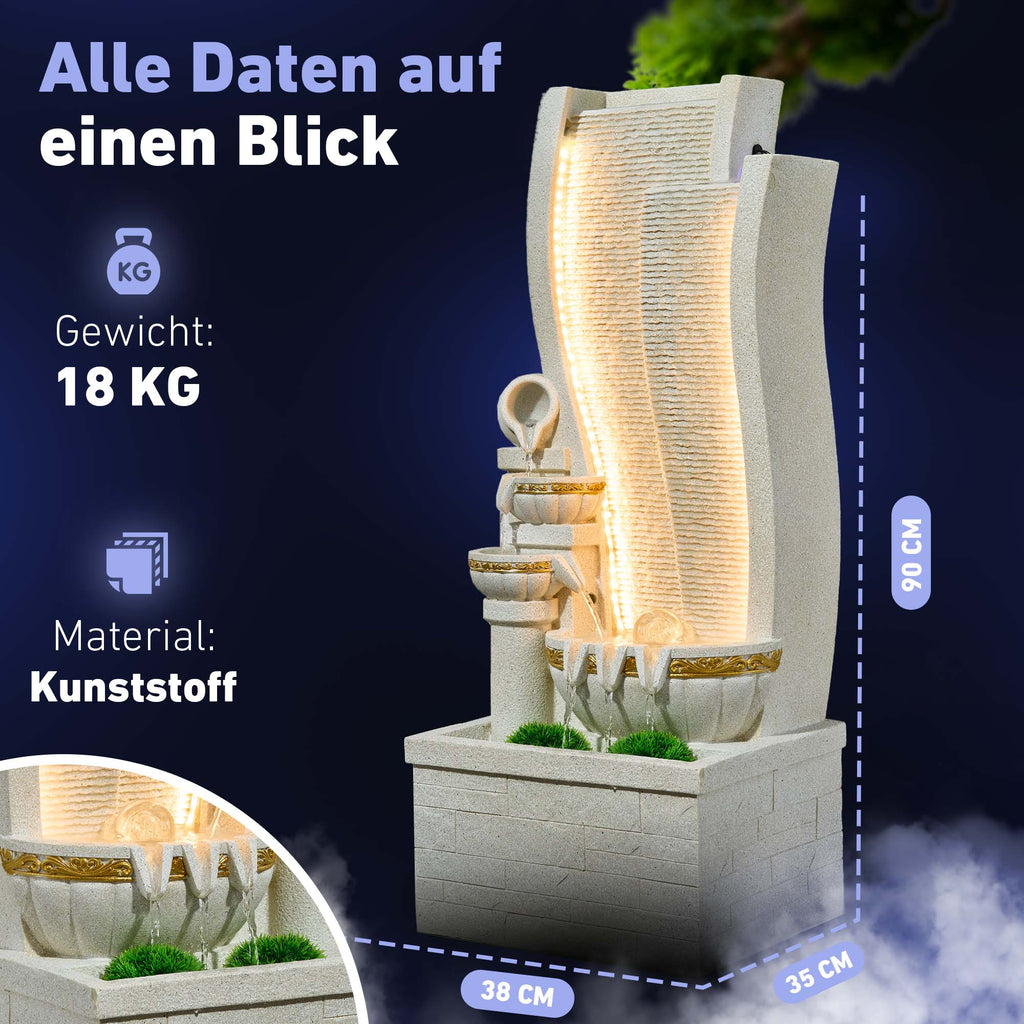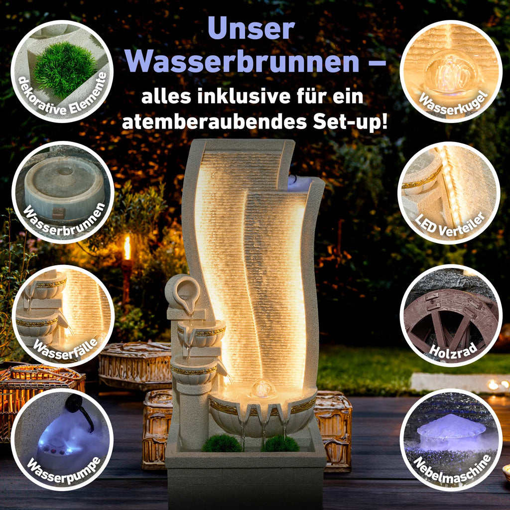 The illuminated waterfall creates a calming atmosphere, while the gentle rippling of the water enchants the senses. The artfully arranged lights emphasize the structure of the fountain and make it appear like a glittering jewel in the dark.
