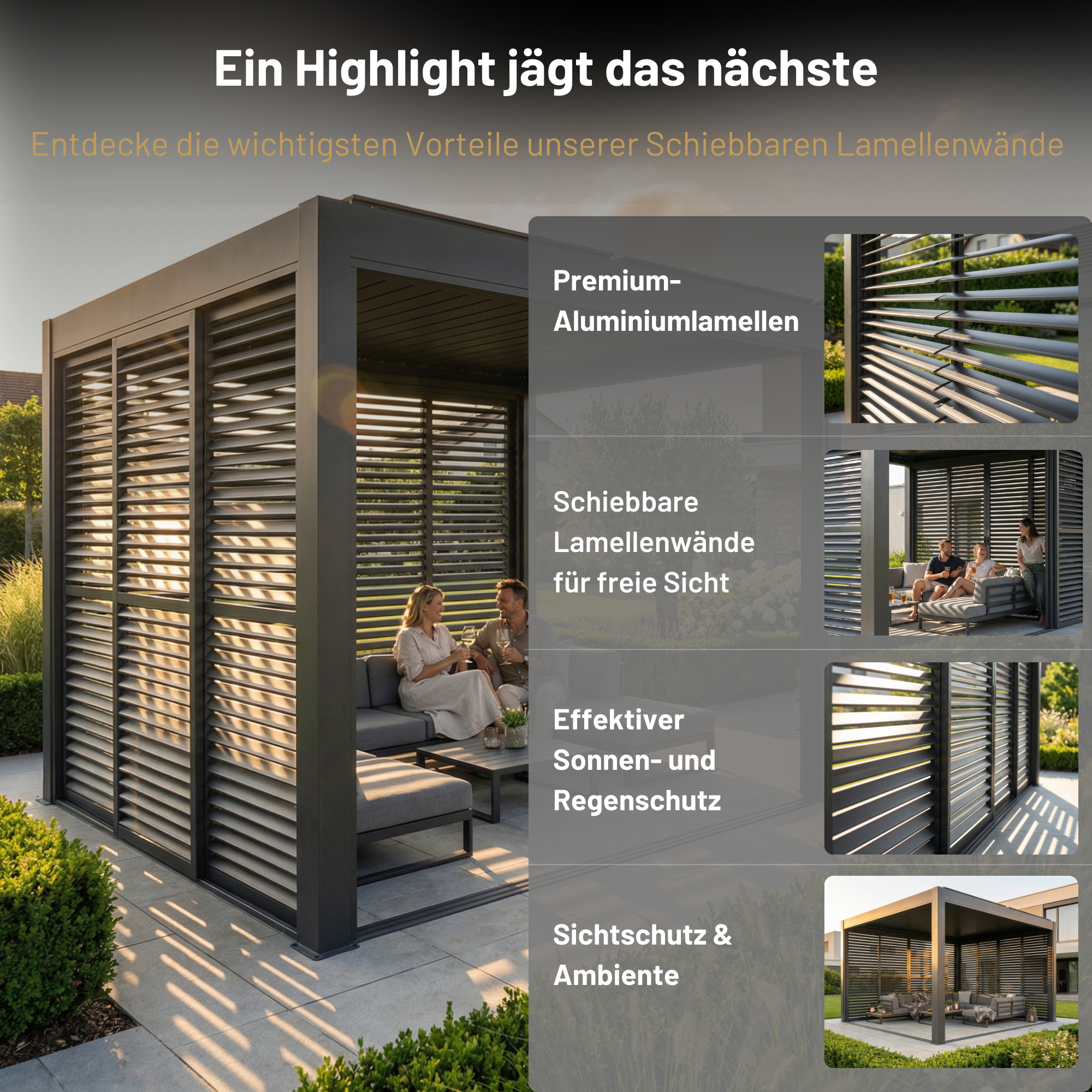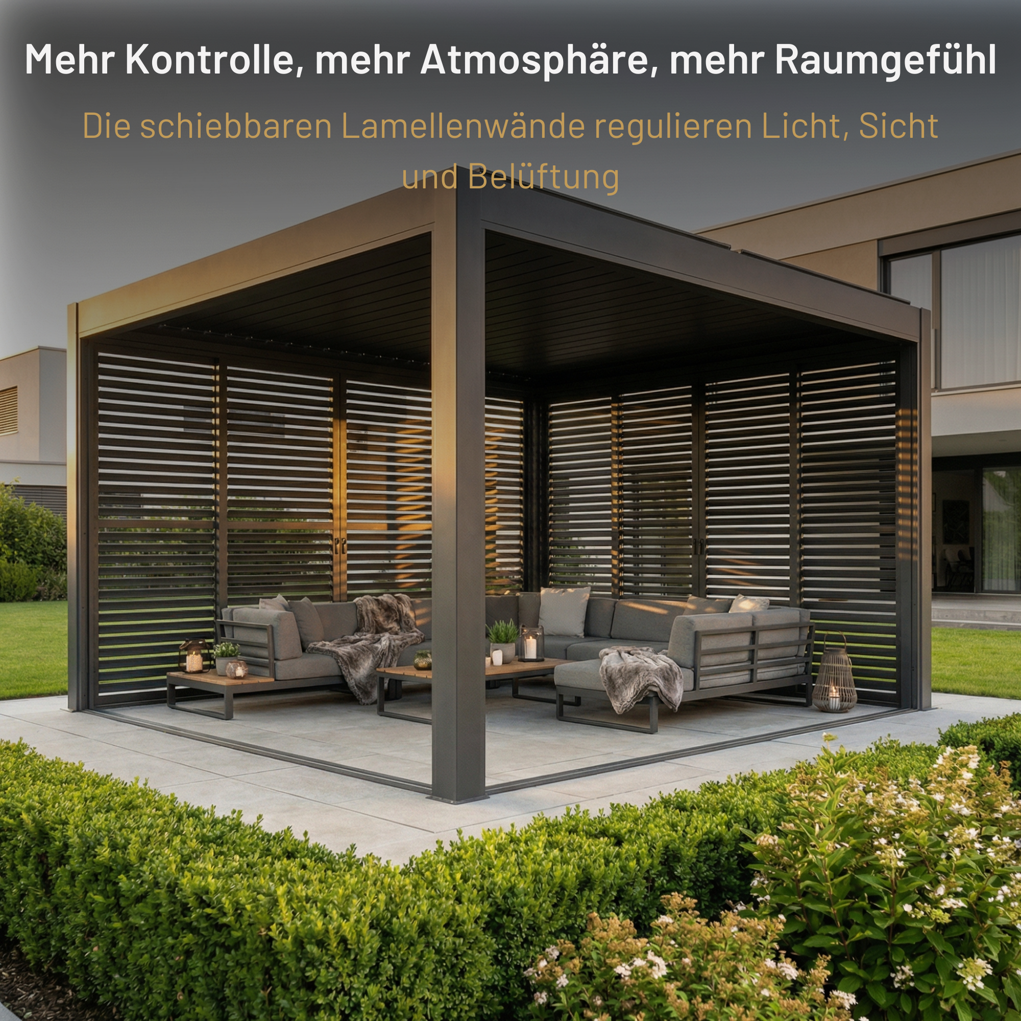 Our slatted walls are also impressively robust and can withstand wind speeds of up to 120 km/h with ease. With this exceptional weather resistance, they not only provide an excellent aesthetic complement to our pergola, but also ensure a reliable and durable solution for protection against strong winds and extreme weather conditions.