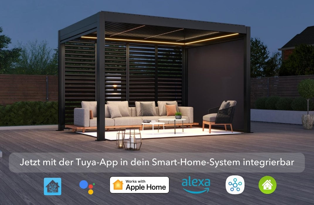 From now on, you can also control your pergola via smartphone - simply using the Tuya app. Whether LED light, slat position or time control: integration into systems such as Alexa, Google Assistant or Apple Home makes your outdoor experience smarter than ever before. A step towards the future - with maximum convenience.