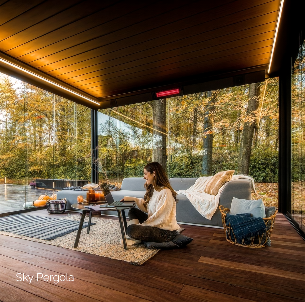 Our Sky pergolas are equipped with an intelligent slatted roof that can be opened and closed at the touch of a button. Integrated rain gutters ensure that you stay pleasantly dry even in summer rain. Thanks to well thought-out accessories, you can use your Sky pergola all year round - whether it's sunny, windy or rainy.