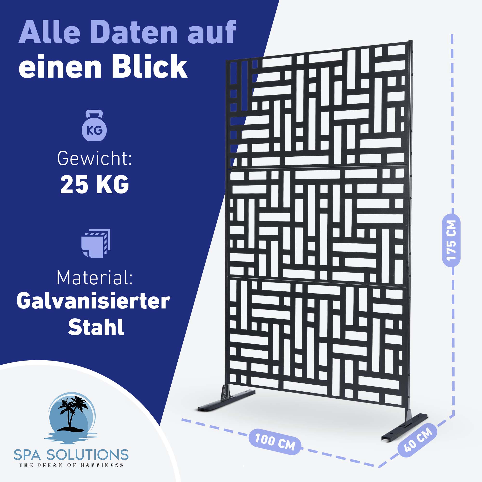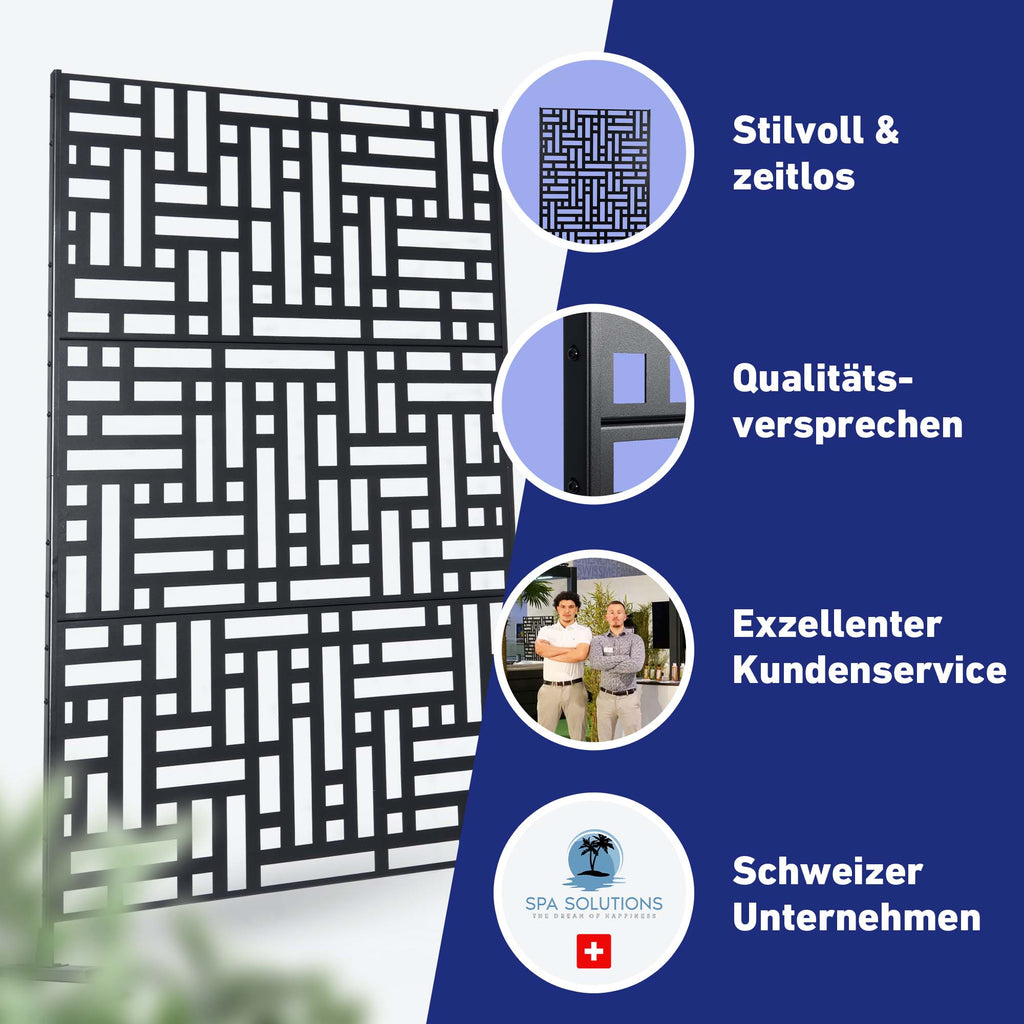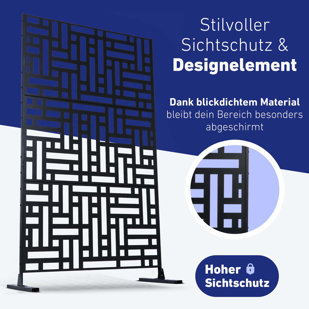 Our Messina privacy screen offers maximum stability thanks to galvanized steel, is rust-free, does not require planning permission (only 1.75 m high) and can be assembled within 10 minutes. It is flexible, free-standing, can be combined with corner and center connectors and offers a 10-year spare parts guarantee with a service life of over 15 years.