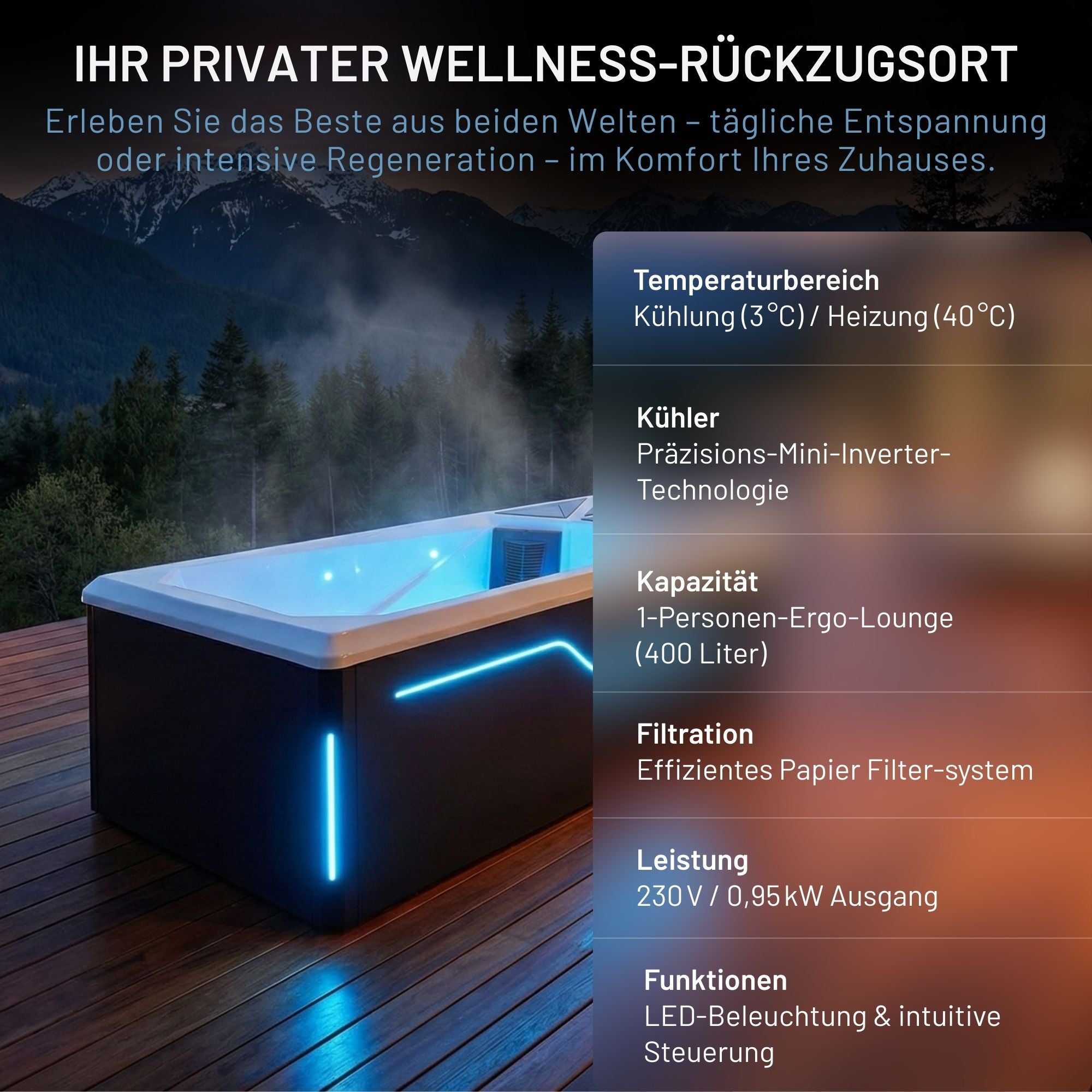 Thanks to the mini-inverter chiller, the water is cooled to up to 3°C - ideal for effective muscle recovery and intensive refreshment after training. At the same time, the integrated heating function allows the water to be heated up to 40°C, so that the Cold Plunge can also be used for soothing heat and relaxation sessions.