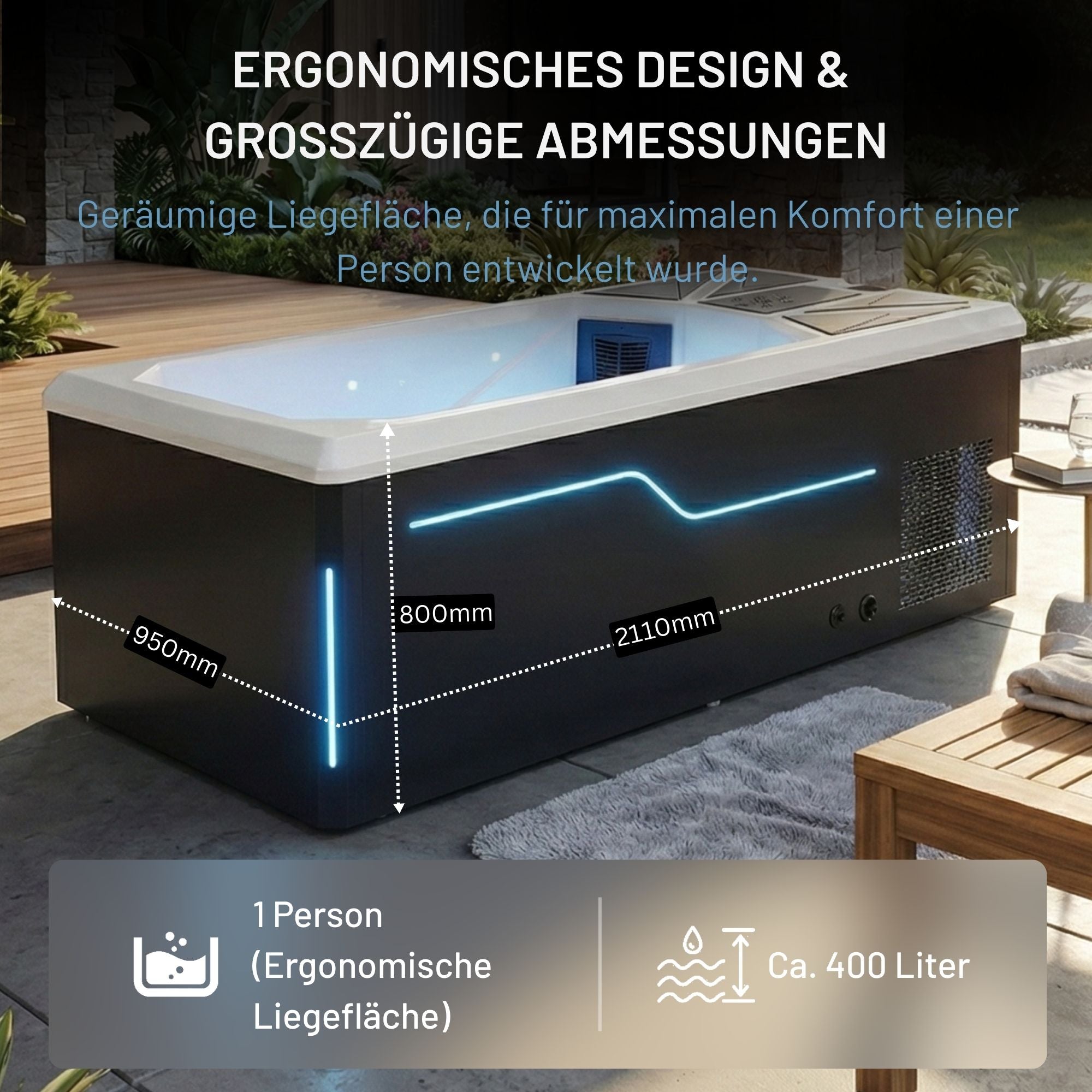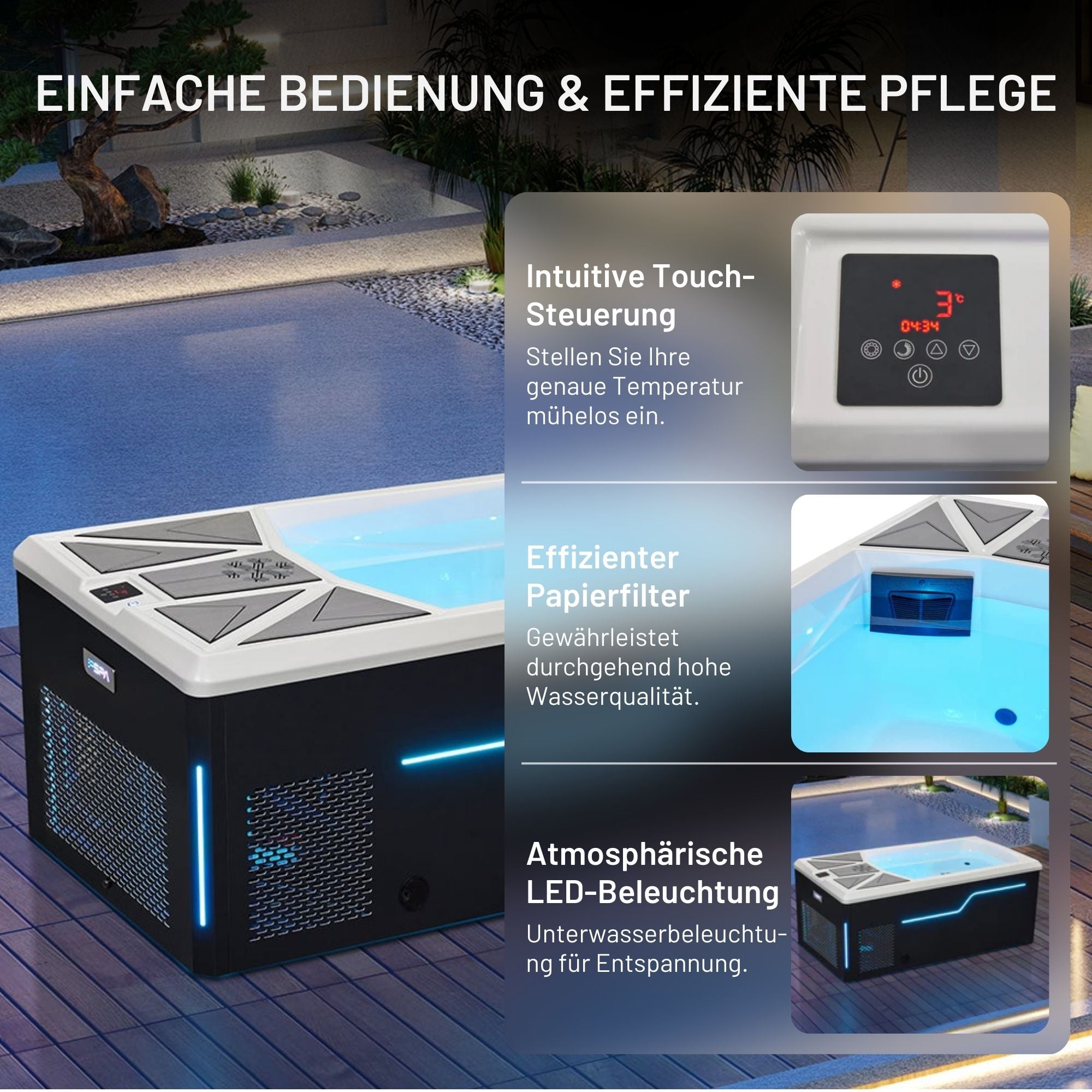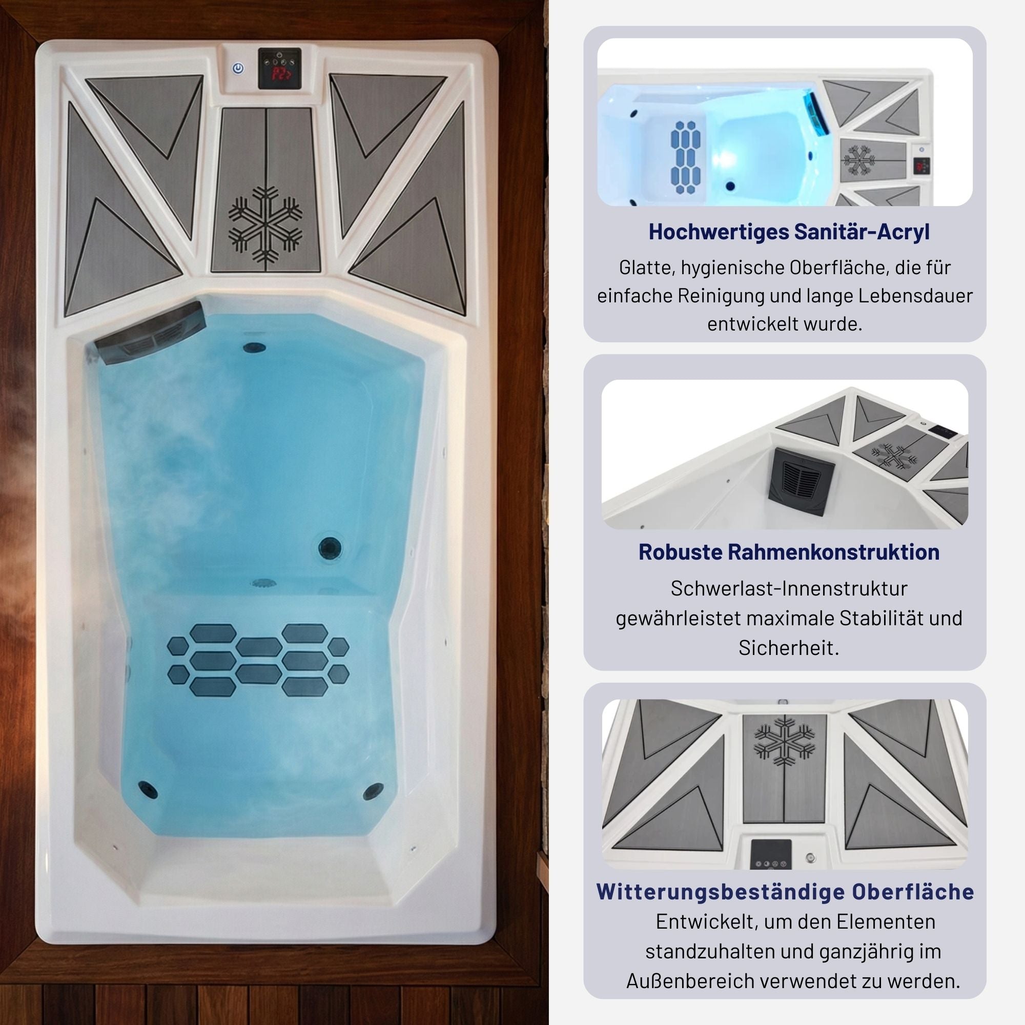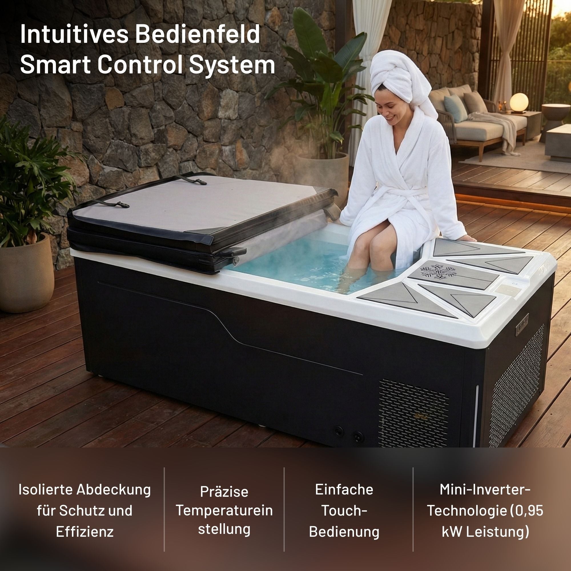 The discreet LED lighting on the outside of the steps ensures a stylish look and safe use, even in the dark. The ambience is complemented by the integrated interior lighting, which gently illuminates the water and creates a relaxing atmosphere - perfect for an exclusive cold plunge experience.