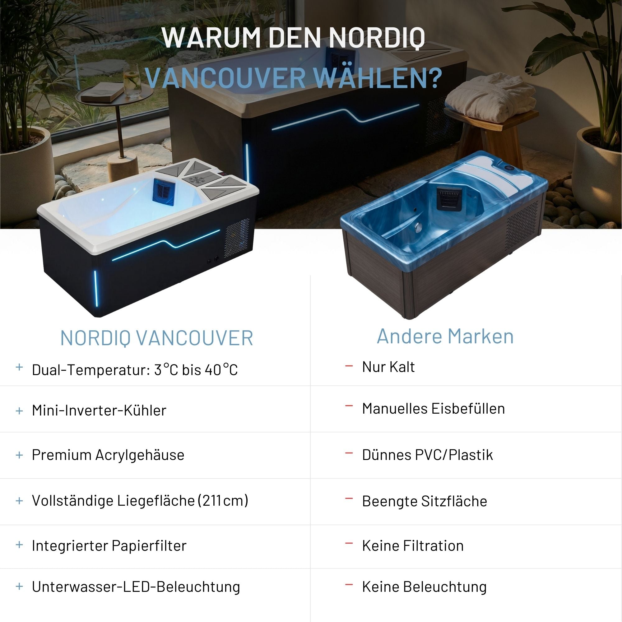 The high-quality acrylic bath ensures long-lasting and easy-care use, while the integrated LED lighting creates a modern and stylish ambience both inside and out. The sophisticated design combines functionality with elegance and makes this Cold Plunge a real eye-catcher - ideal for anyone looking for luxurious relaxation after sport or in a wellness oasis.