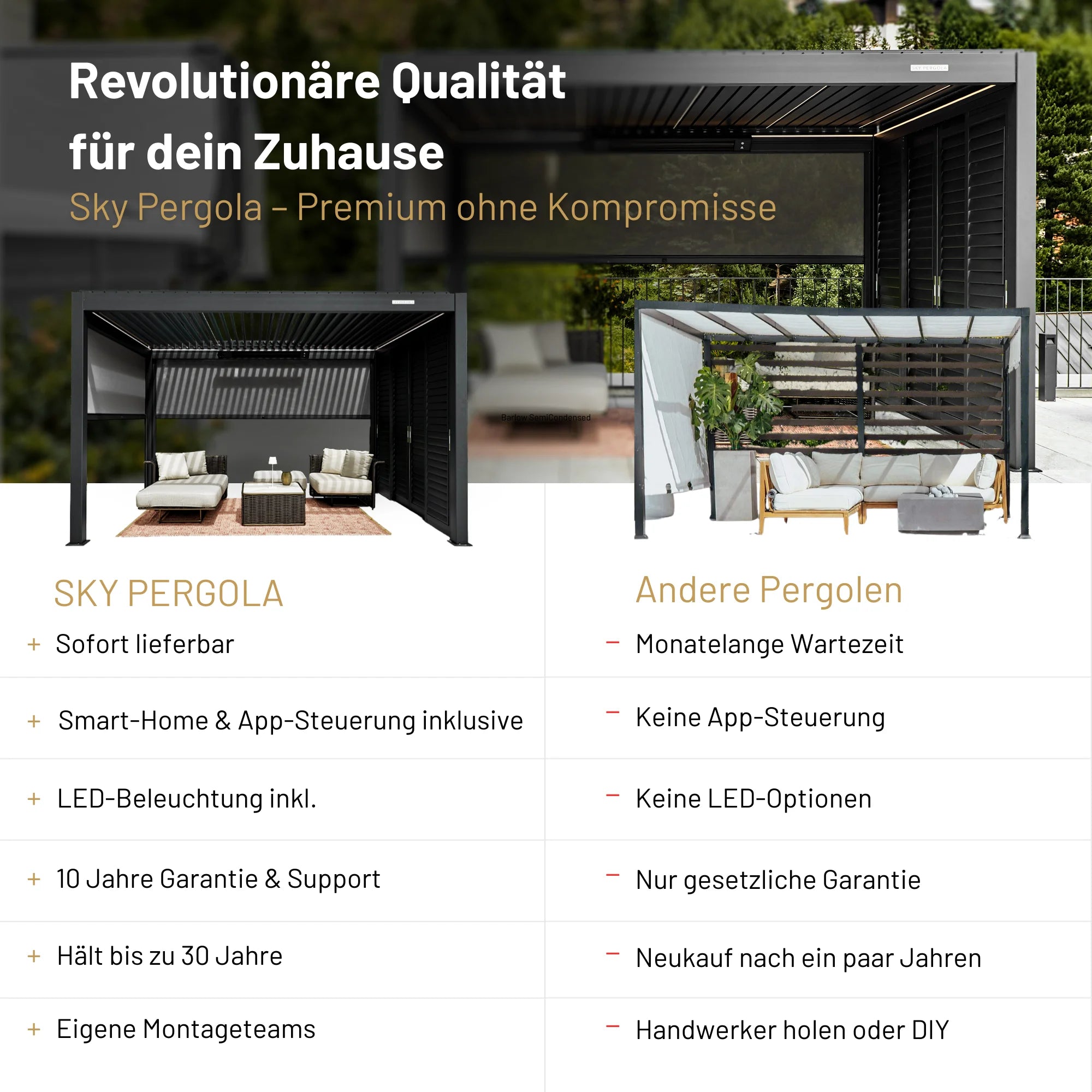 In many countries, the pergola has long been an integral part of high-quality gardens and terraces - and in Germany and Switzerland, too, it is becoming an absolute must-have. Whether garden, pool area, patio or roof terrace: a Sky Pergola immediately adds style, comfort and functionality to any outdoor area.