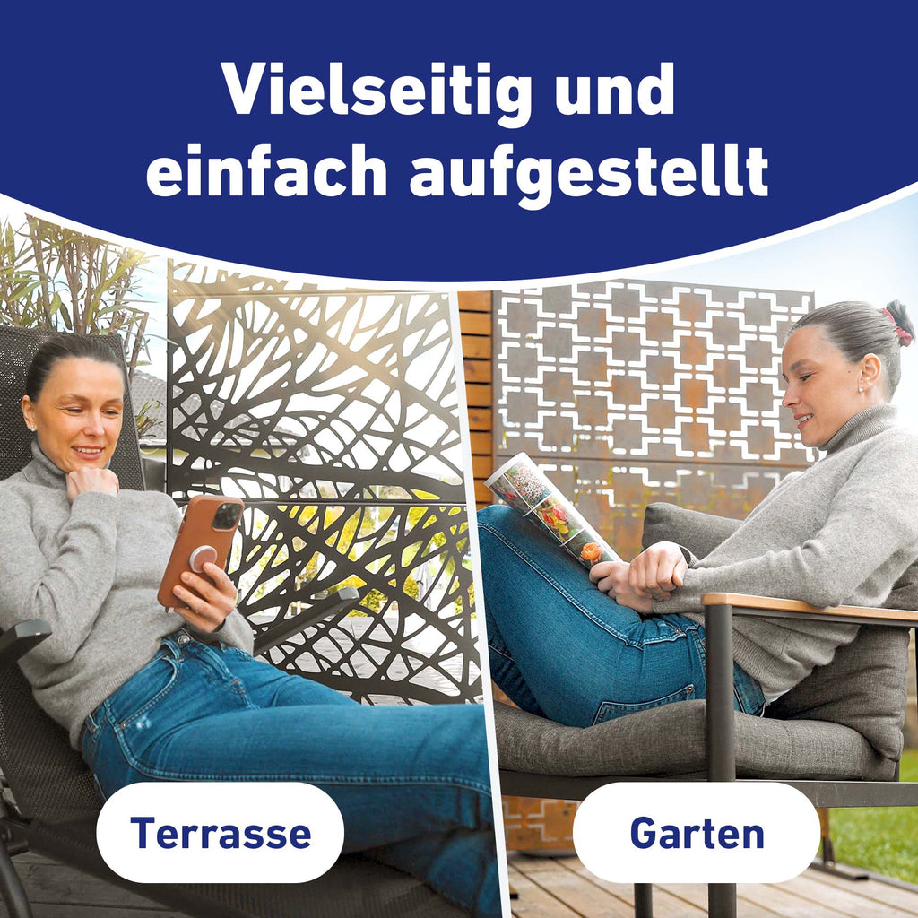 Notre brise-vue Messina offre une stabilité maximale grâce à l'acier galvanisé, est inoxydable, ne nécessite pas de permis de construire (seulement 1,75 m de haut) et se monte en 10 minutes. Elle est flexible et autoportante, peut être combinée avec des raccords d'angle et des raccords centraux et offre une garantie de 10 ans sur les pièces de rechange pour une durée de vie de plus de 15 ans.