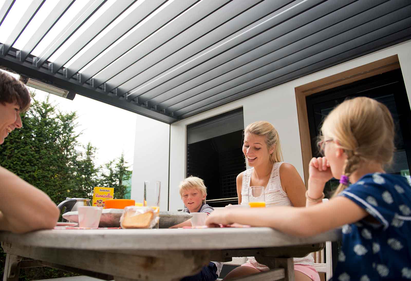 La pergola peut être équipée de différentes extensions : stores motorisés, parois vitrées latérales, parois à lamelles, radiateurs et capteurs météorologiques. Les stores motorisés peuvent également être facilement commandés via une application.