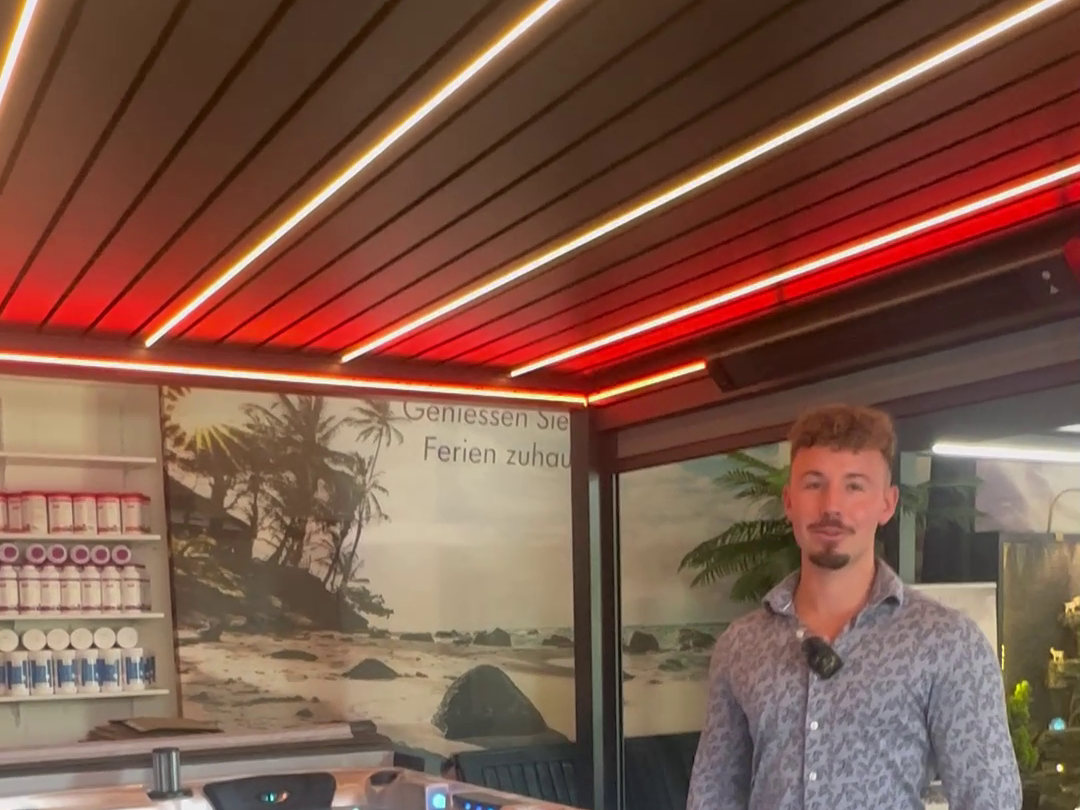 Vous pouvez ajouter différents accessoires pratiques à votre pergola Sky afin d'augmenter encore le confort et la fonctionnalité. Il s'agit notamment de parois à lamelles fixes ou coulissantes pour une protection latérale contre les regards et le vent, d'élégantes parois en verre pour une protection transparente contre les intempéries, ainsi que de stores latéraux qui peuvent être actionnés manuellement ou motorisés, selon vos souhaits. Des radiateurs infrarouges peuvent être installés pour obtenir des températures agréables même par temps frais, tandis que des ventilateurs assurent une meilleure circulation de l'air lors des chaudes journées d'été. De plus, il est possible d'intégrer un détecteur de pluie qui ferme automatiquement les lamelles lorsqu'il commence à pleuvoir. Votre pergola Sky devient ainsi un lieu de retraite à l'extérieur, utilisable toute l'année.