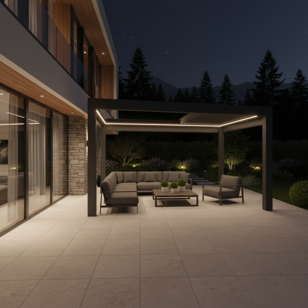 Unsere Pergola ist mit einer eleganten LED-Beleuchtung ausgestattet. Im Rahmen befindet sich eine dimmbare warmweiße LED-Lichtleiste, die eine stilvolle und angenehme Atmosphäre schafft. Die Beleuchtung ist wetterfest, energieeffizient und kann bequem per App, Sprachsteuerung oder Fernbedienung gesteuert werden.