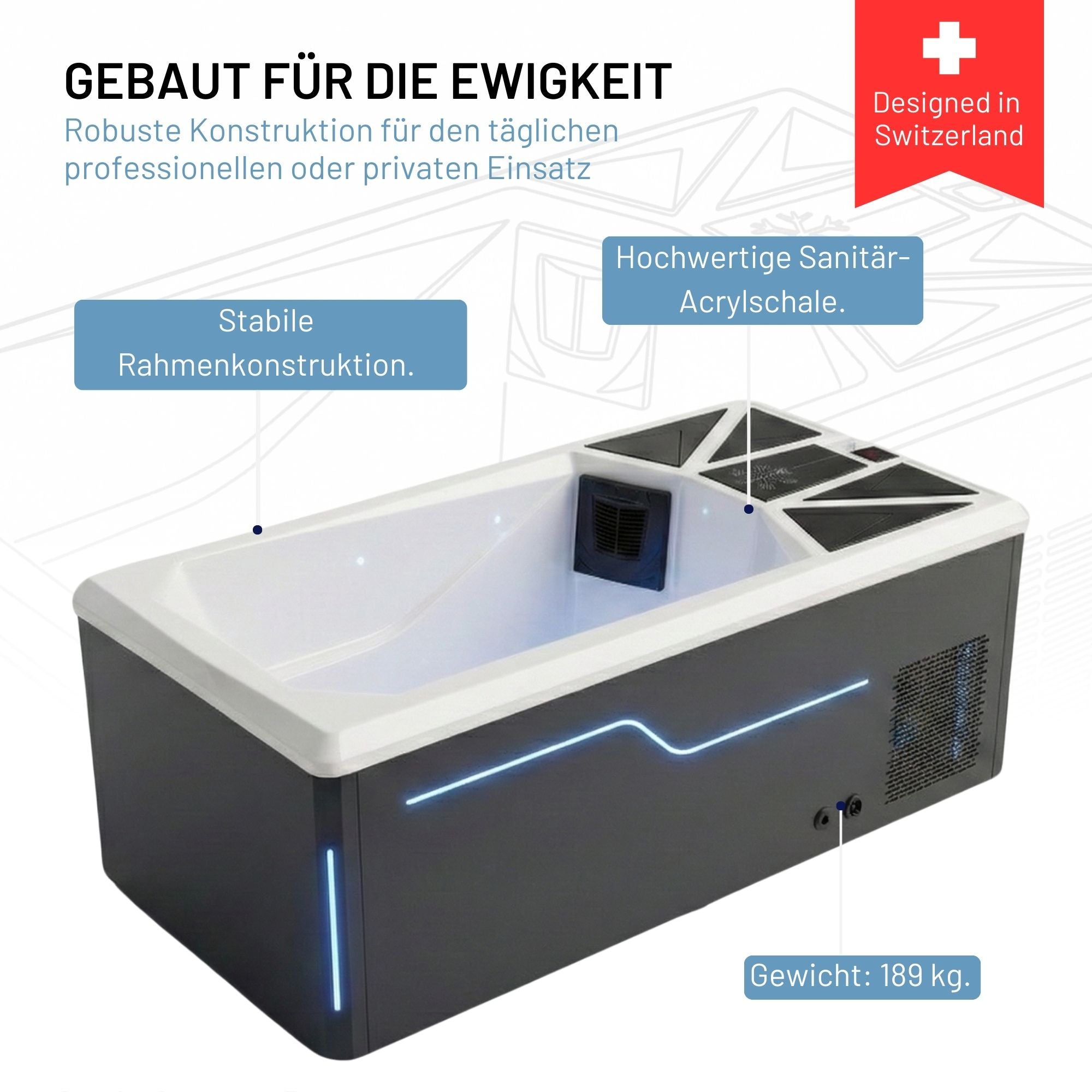 La baignoire en acrylique de qualité supérieure garantit une utilisation durable et facile d'entretien, tandis que l'éclairage LED intégré à l'intérieur et à l'extérieur crée une ambiance moderne et stylée. Le design bien pensé allie fonctionnalité et élégance et fait de ce Cold Plunge un véritable accroche-regard - idéal pour tous ceux qui recherchent une détente luxueuse après le sport ou dans une oasis de bien-être.