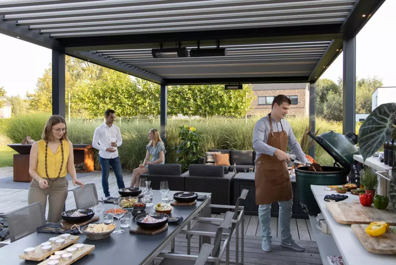 Nos pergolas Sky sont équipées d'un toit à lamelles intelligent qui s'ouvre et se ferme par simple pression sur un bouton. Des gouttières intégrées vous permettent de rester agréablement au sec même en cas de pluie estivale. Grâce à des accessoires bien pensés, vous pouvez utiliser votre pergola Sky toute l'année, que ce soit par temps ensoleillé, venteux ou pluvieux.
