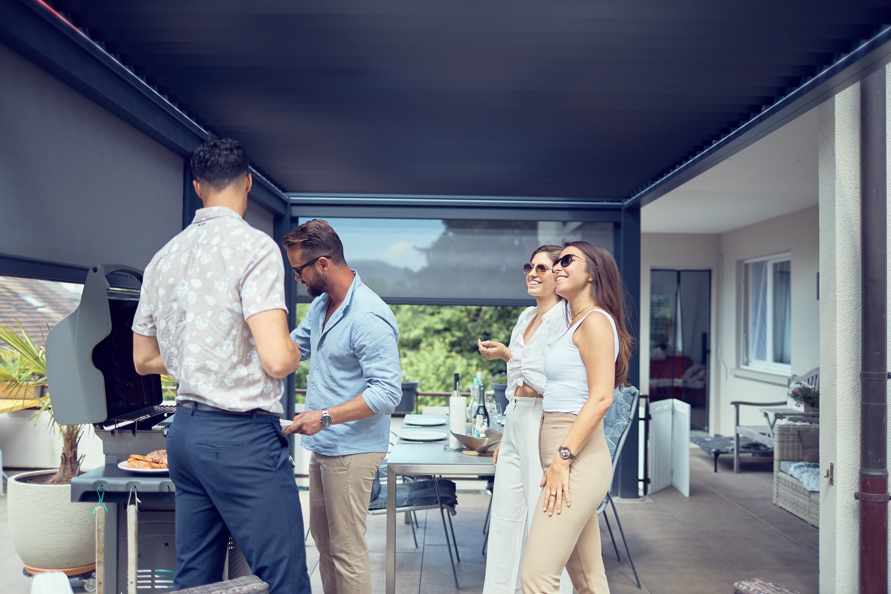 Les stores latéraux Sky Pergola, les parois à lamelles ou les parois en verre permettent de fermer les côtés de manière flexible et de réduire efficacement le vent - pour encore plus de confort par tous les temps.