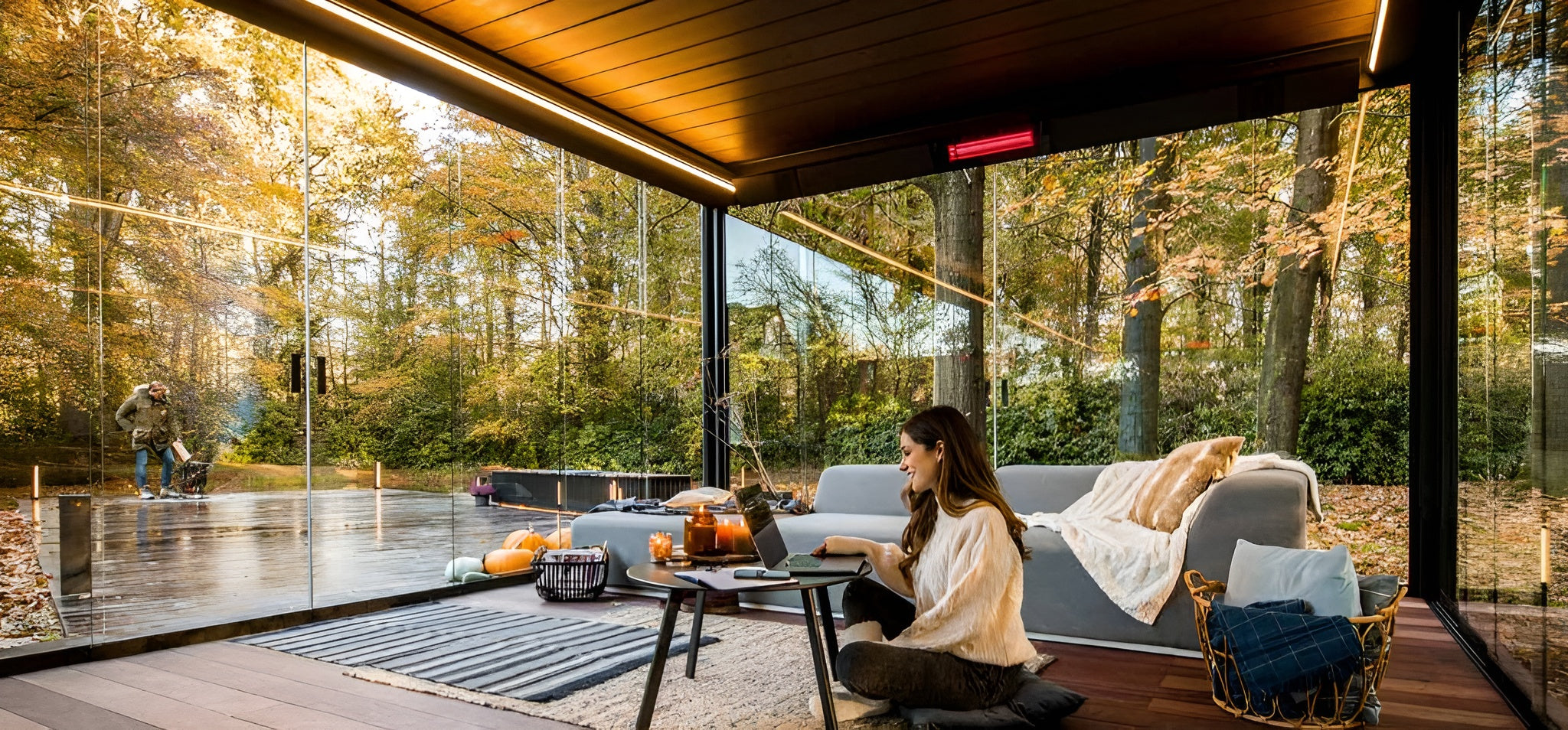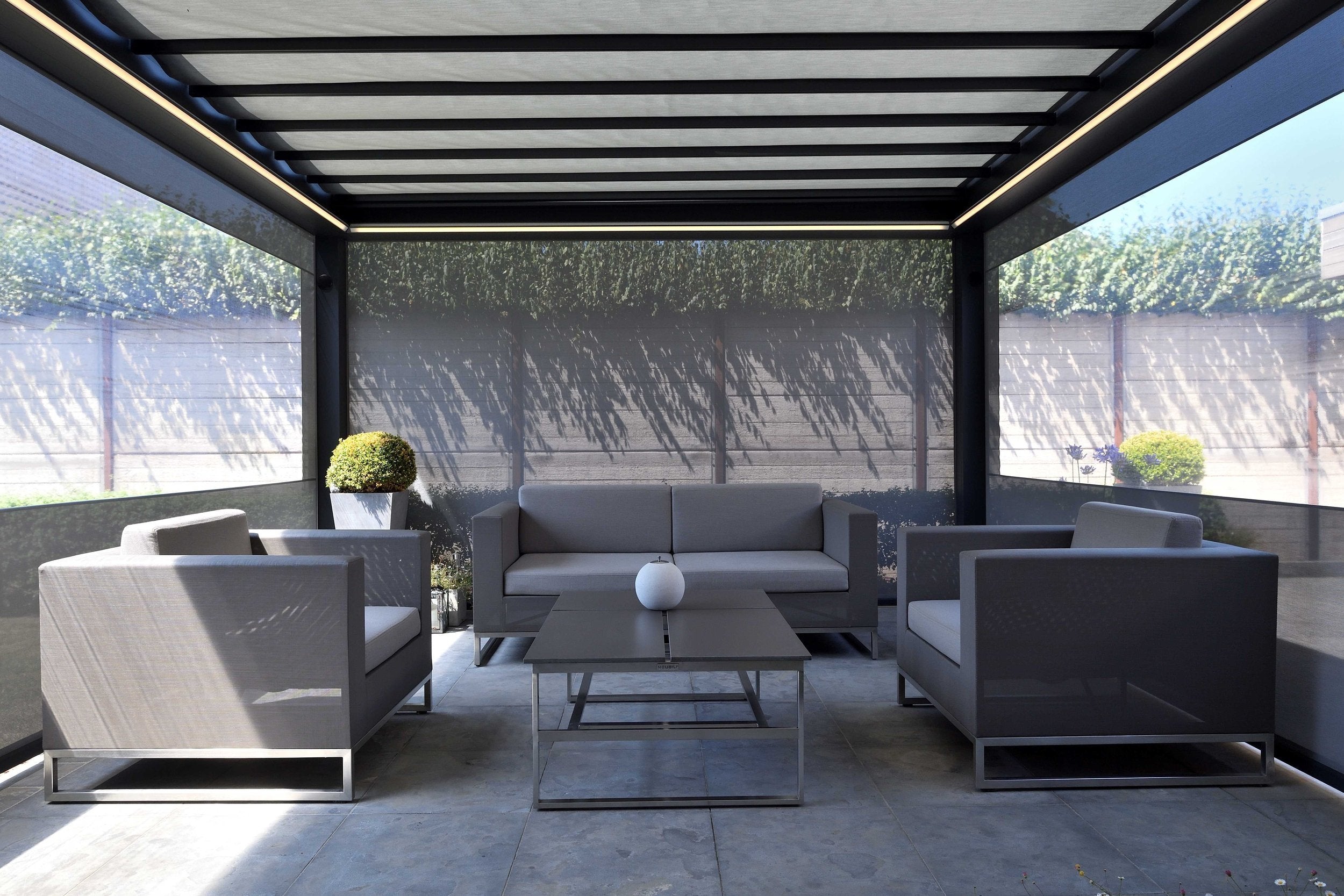 La pergola peut être équipée de différentes extensions : stores motorisés, parois vitrées latérales, parois à lamelles, radiateurs et capteurs météorologiques. Les stores motorisés peuvent également être facilement commandés via une application.