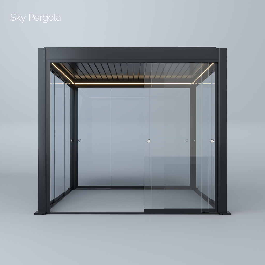 Vous pouvez ajouter différents accessoires pratiques à votre pergola Sky afin d'augmenter encore le confort et la fonctionnalité. Il s'agit notamment de parois à lamelles fixes ou coulissantes pour une protection latérale contre les regards et le vent, d'élégantes parois en verre pour une protection transparente contre les intempéries, ainsi que de stores latéraux qui peuvent être actionnés manuellement ou motorisés, selon vos souhaits. Des radiateurs infrarouges peuvent être installés pour obtenir des températures agréables même par temps frais, tandis que des ventilateurs assurent une meilleure circulation de l'air lors des chaudes journées d'été. De plus, il est possible d'intégrer un détecteur de pluie qui ferme automatiquement les lamelles lorsqu'il commence à pleuvoir. Votre pergola Sky devient ainsi un lieu de retraite à l'extérieur, utilisable toute l'année.
