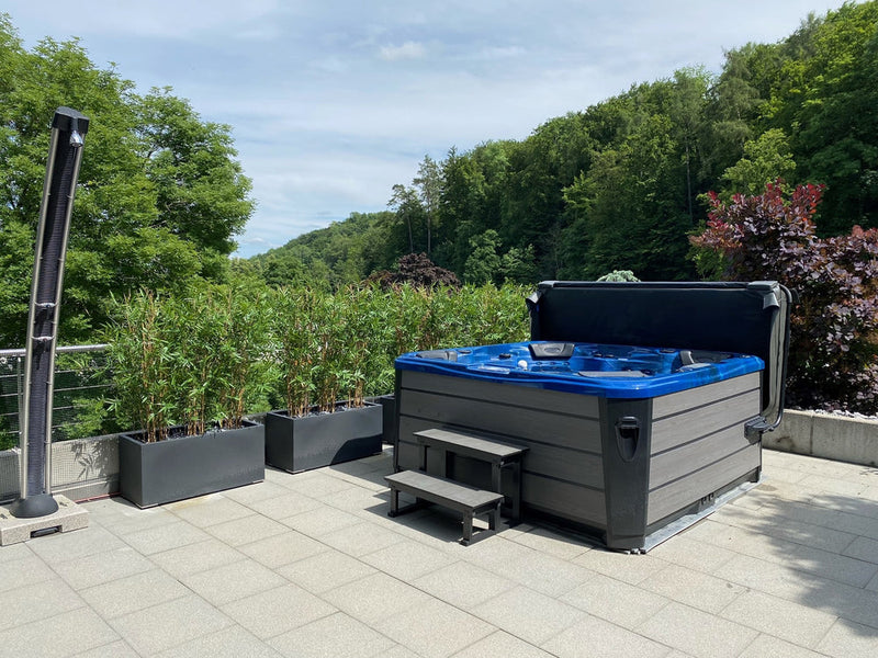 Prima di acquistare una vasca idromassaggio da esterno, è necessario scegliere un luogo adatto. Dovete assicurarvi che ci sia spazio sufficiente per la vasca idromassaggio e che la superficie sia stabile e senza dislivelli. Altrettanto importante è l'accesso alla rete elettrica e idrica.