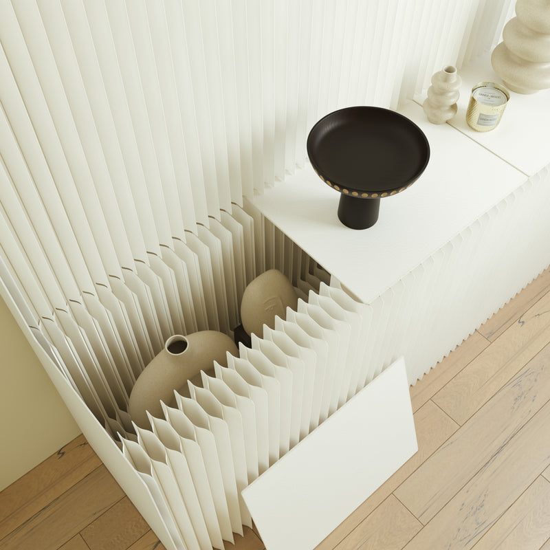 Il nostro mobile in carta craft non solo offre un elegante spazio di archiviazione, ma sottolinea anche la bellezza e la sostenibilità del materiale. Realizzato con carta artigianale di alta qualità, è ecologico ed eccezionalmente robusto, per un mobile di lunga durata.