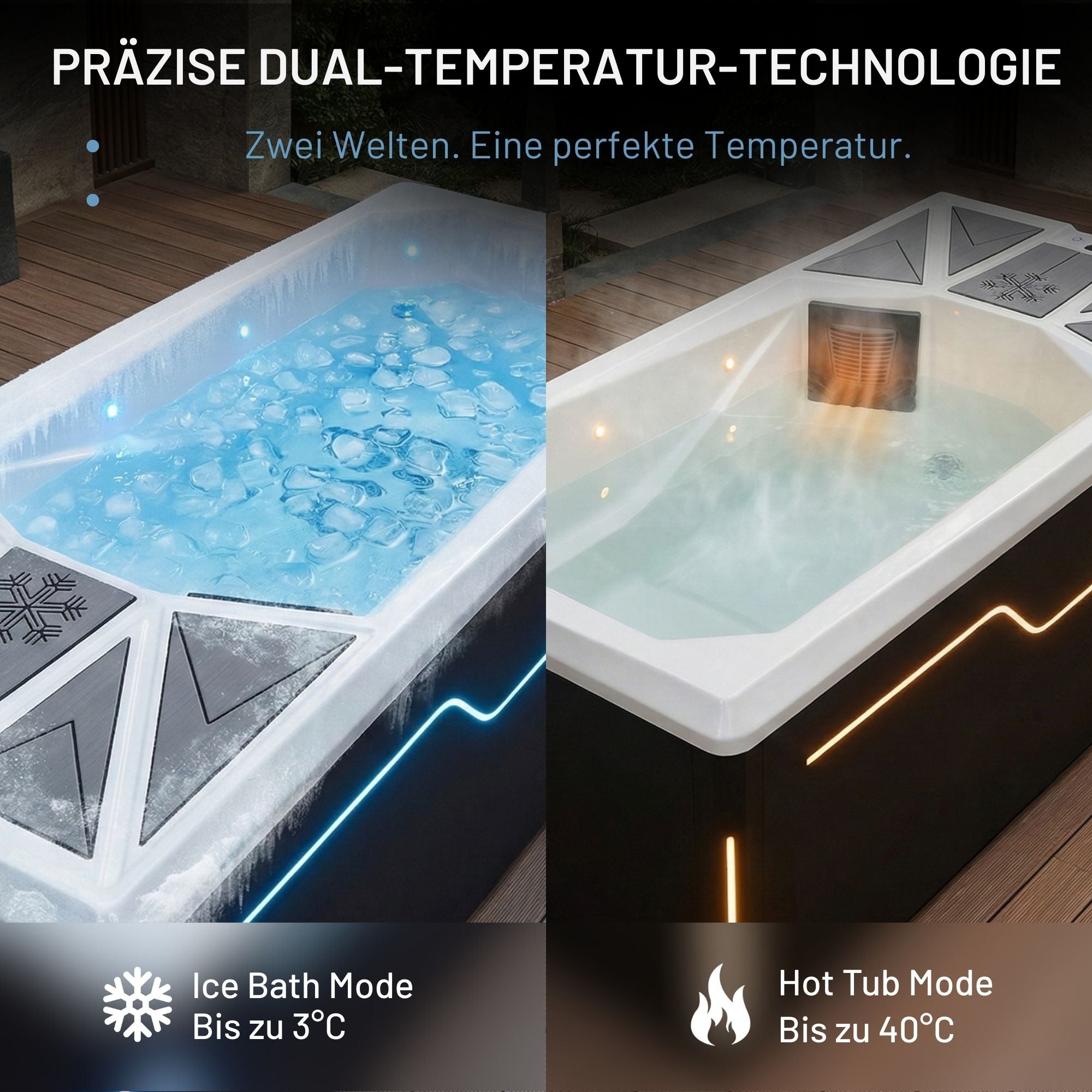 La vasca in acrilico di alta qualità garantisce una lunga durata e una facile manutenzione, mentre l'illuminazione a LED integrata crea un ambiente moderno ed elegante sia all'interno che all'esterno. Il design sofisticato combina funzionalità ed eleganza e rende questo Cold Plunge un vero e proprio richiamo visivo, ideale per chi cerca un relax di lusso dopo lo sport o in un'oasi di benessere.