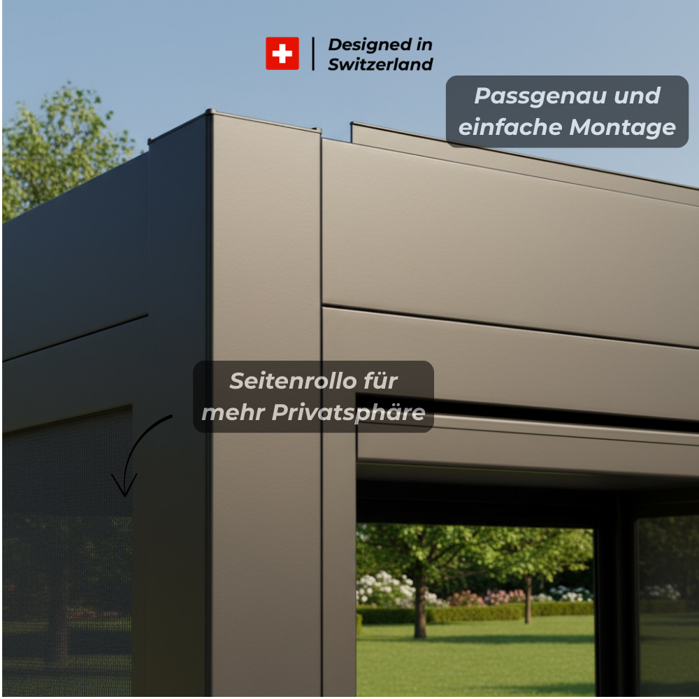 Per le pergole personalizzate, tuttavia, si consiglia di pianificare le tende laterali direttamente al momento dell'ordine, in quanto un ordine ripetuto in un secondo momento è associato a un tempo di consegna di 3 o 4 mesi.