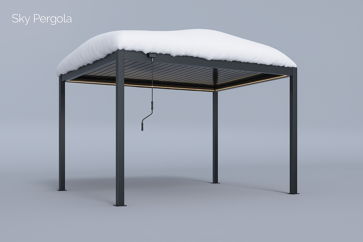 A seconda del modello, le nostre Sky Pergola sono progettate per carichi di neve compresi tra 50 kg/m² e 150 kg/m². Nelle regioni alpine o in caso di forti nevicate, si consiglia di lasciare le lamelle aperte, in modo che la neve possa cadere senza ostacoli e non ci sia un carico eccessivo sul tetto.