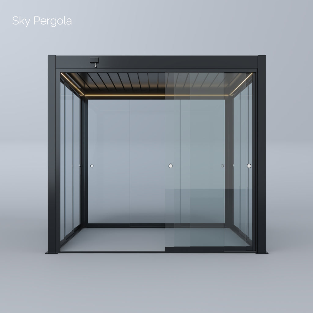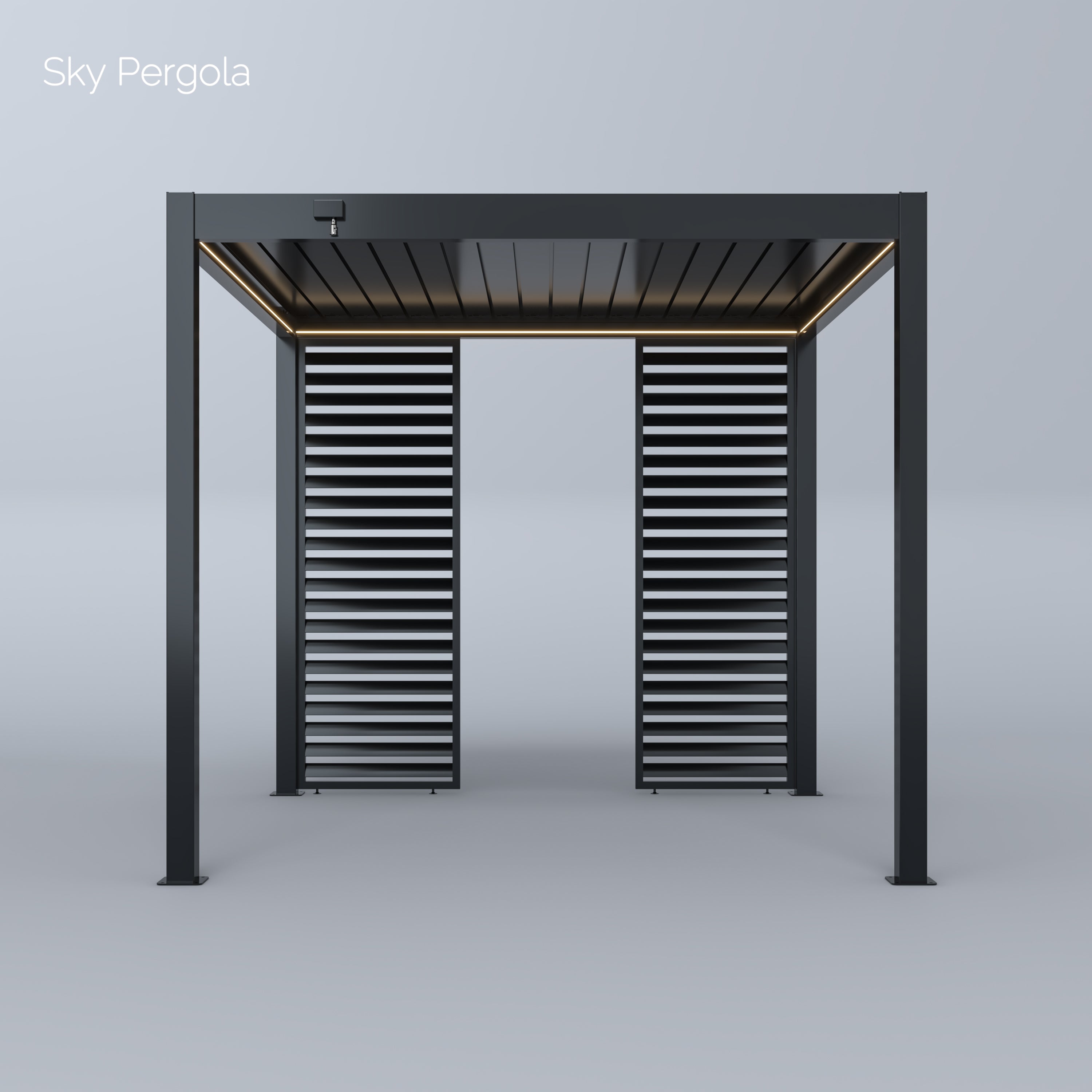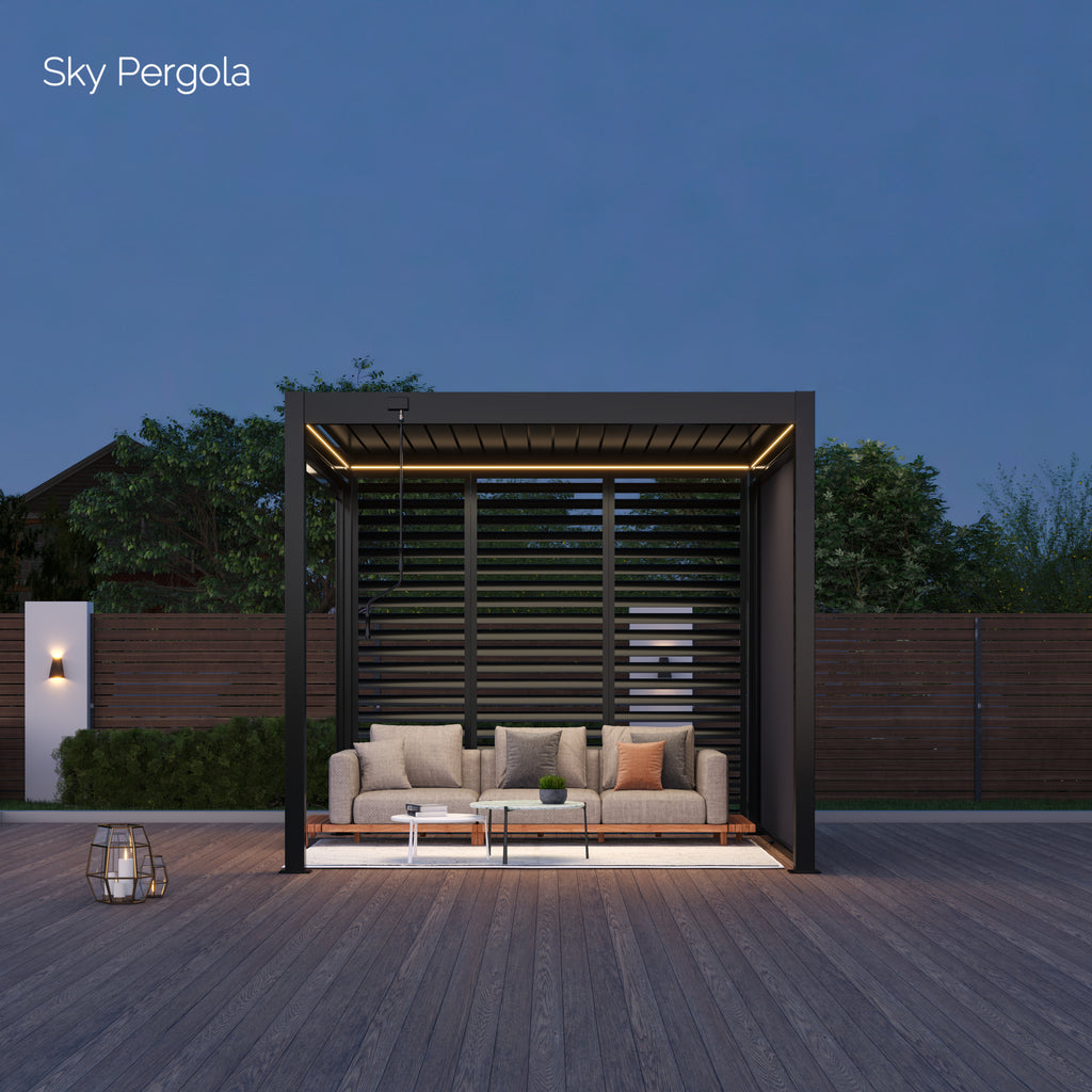 Per aumentare ulteriormente il comfort e la funzionalità della pergola Sky è possibile aggiungere diversi accessori pratici. Tra questi, le pareti a doghe fisse o scorrevoli per la privacy laterale e la protezione dal vento, le eleganti pareti in vetro per una protezione trasparente dalle intemperie e le tende a rullo laterali, che possono essere azionate manualmente o motorizzate a seconda delle esigenze. È possibile installare riscaldatori radianti a infrarossi per ottenere temperature piacevoli anche nelle giornate più fresche, mentre i ventilatori garantiscono una migliore circolazione dell'aria nelle calde giornate estive. È inoltre possibile integrare un sensore pioggia che chiude automaticamente le lamelle quando inizia a piovere. In questo modo la pergola Sky diventa un rifugio all'aperto utilizzabile tutto l'anno.
