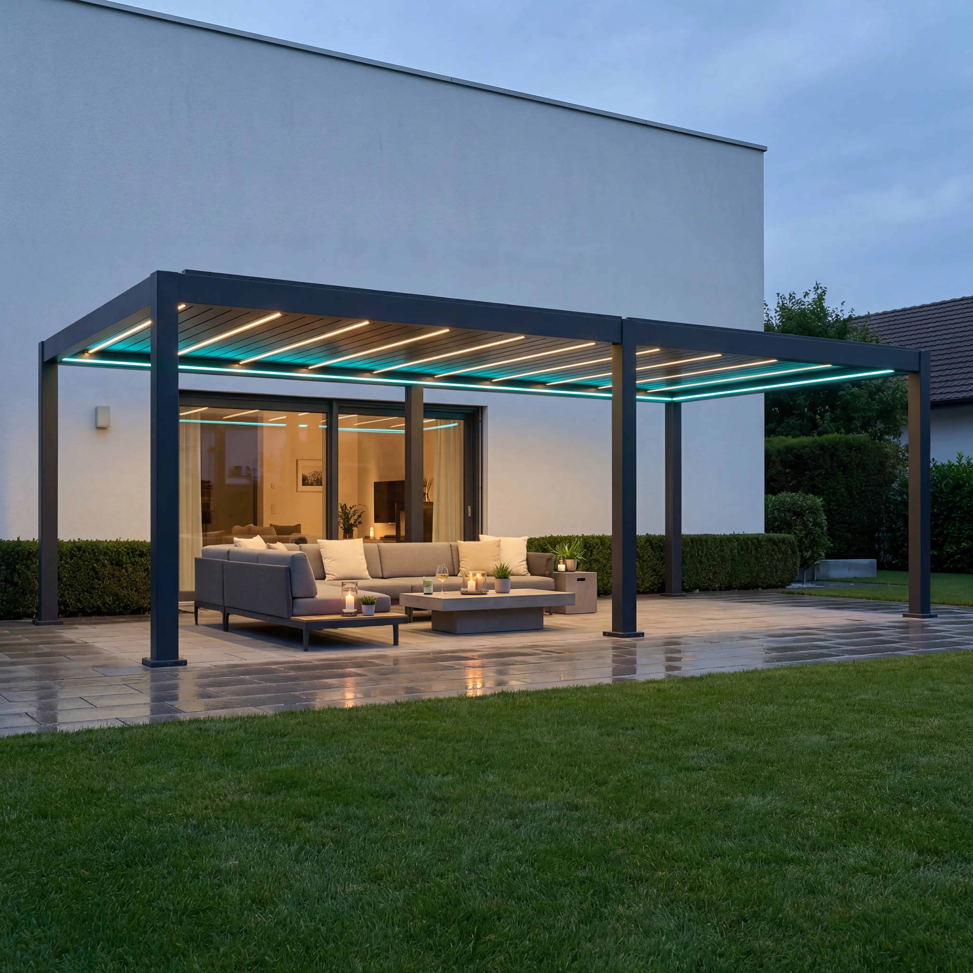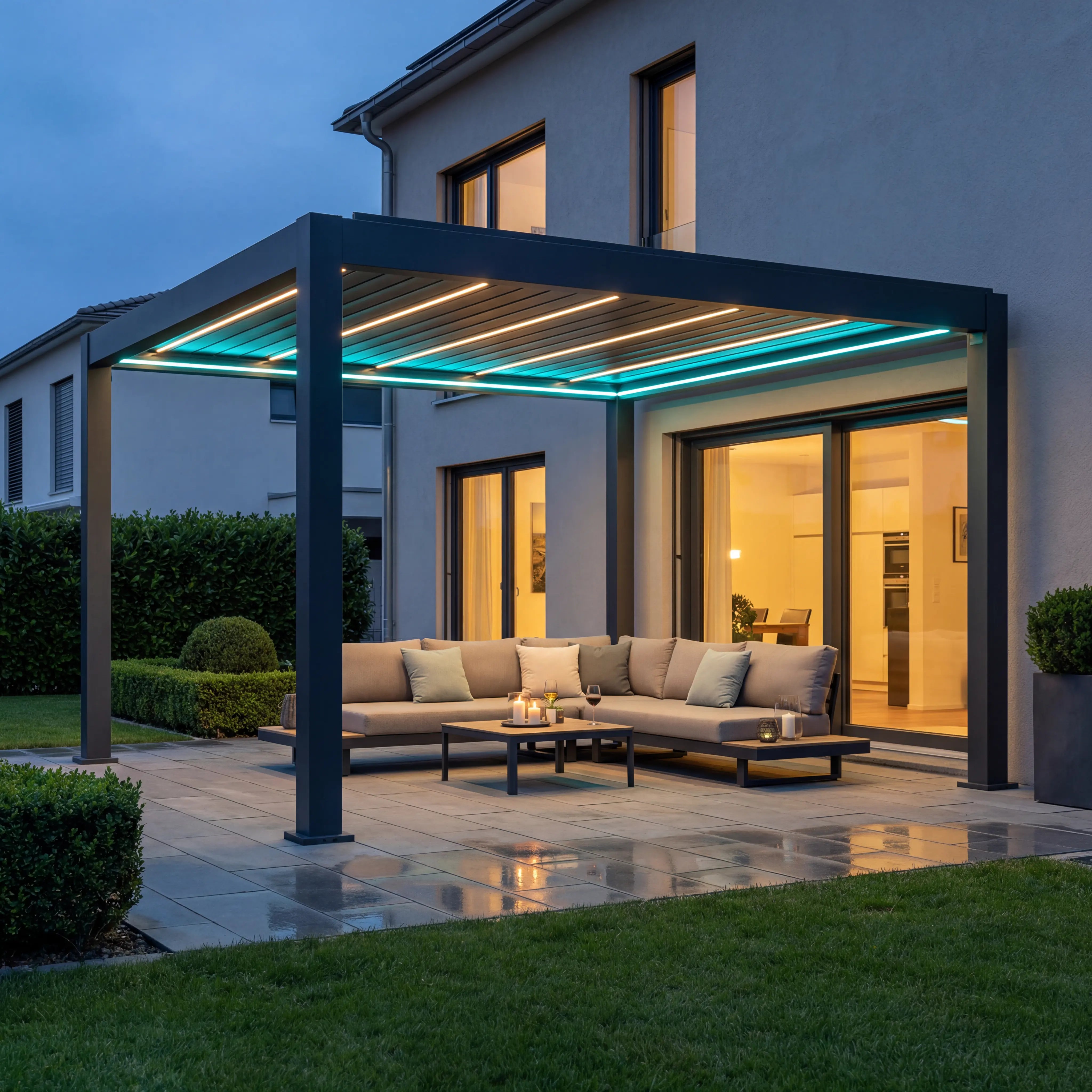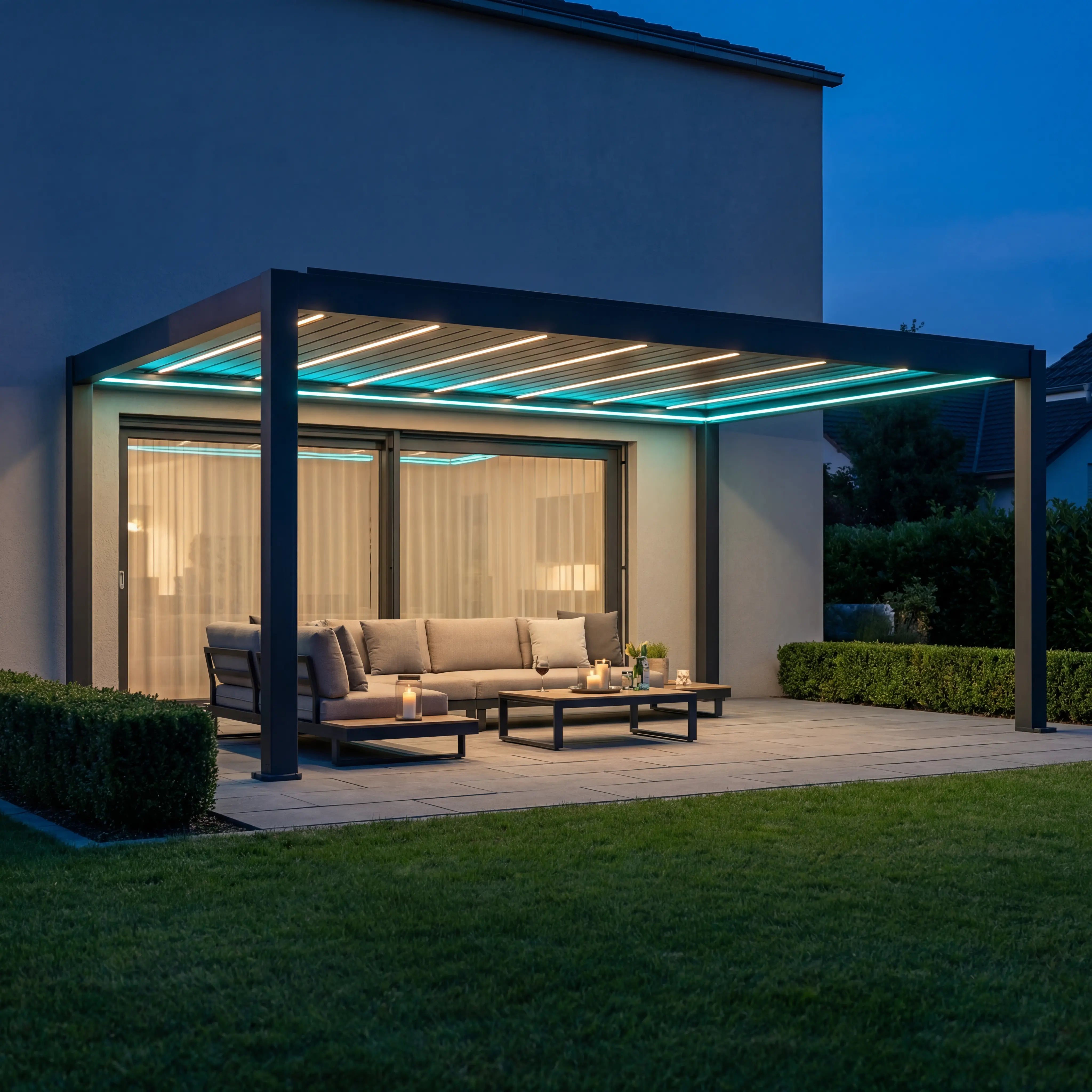 Nel telaio della pergola sono integrate strisce LED RGB resistenti alle intemperie, che si illuminano in tutti i colori e possono essere controllate individualmente. Nelle lamelle stesse è presente un'illuminazione a LED di colore bianco caldo, che fornisce una luce piacevole e d'atmosfera. Sia l'illuminazione RGB nella cornice che la luce bianca calda nelle lamelle sono completamente dimmerabili - controllabili tramite app, comando vocale o telecomando.