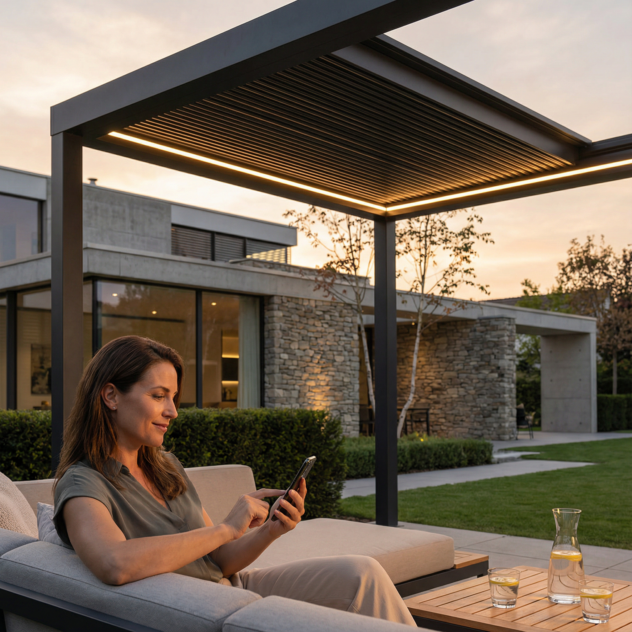 Con l'app intelligente, potete controllare facilmente tutte le funzioni della vostra pergola: aprire o chiudere le lamelle, attenuare l'illuminazione a LED, selezionare i colori RGB o ritirare le tende, il tutto direttamente dal vostro divano o in viaggio.