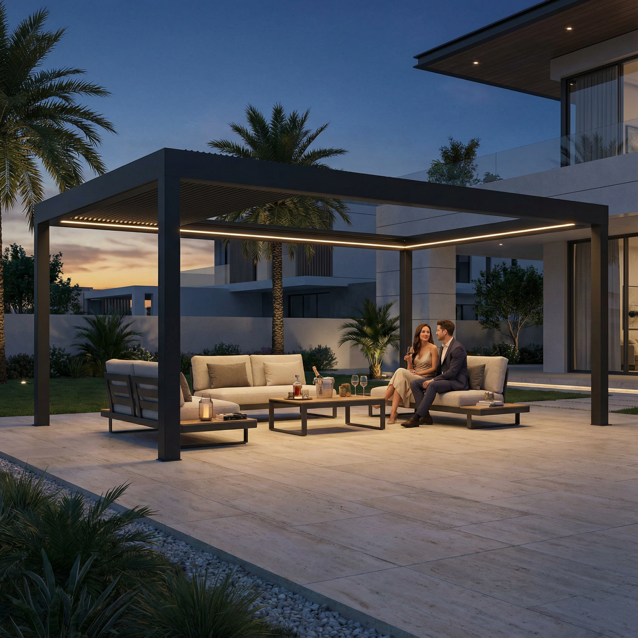 Die SkyInfinity Pro Pergola vereint modernste Technologie mit luxuriösem Design. Ihr motorisiertes, bis zu 75 % aufschiebbares Lamellendach und die integrierte, dimmbare LED-Beleuchtung im Rahmen schaffen ein einzigartiges Outdoor-Erlebnis – offen, flexibel und gleichzeitig wettergeschützt.