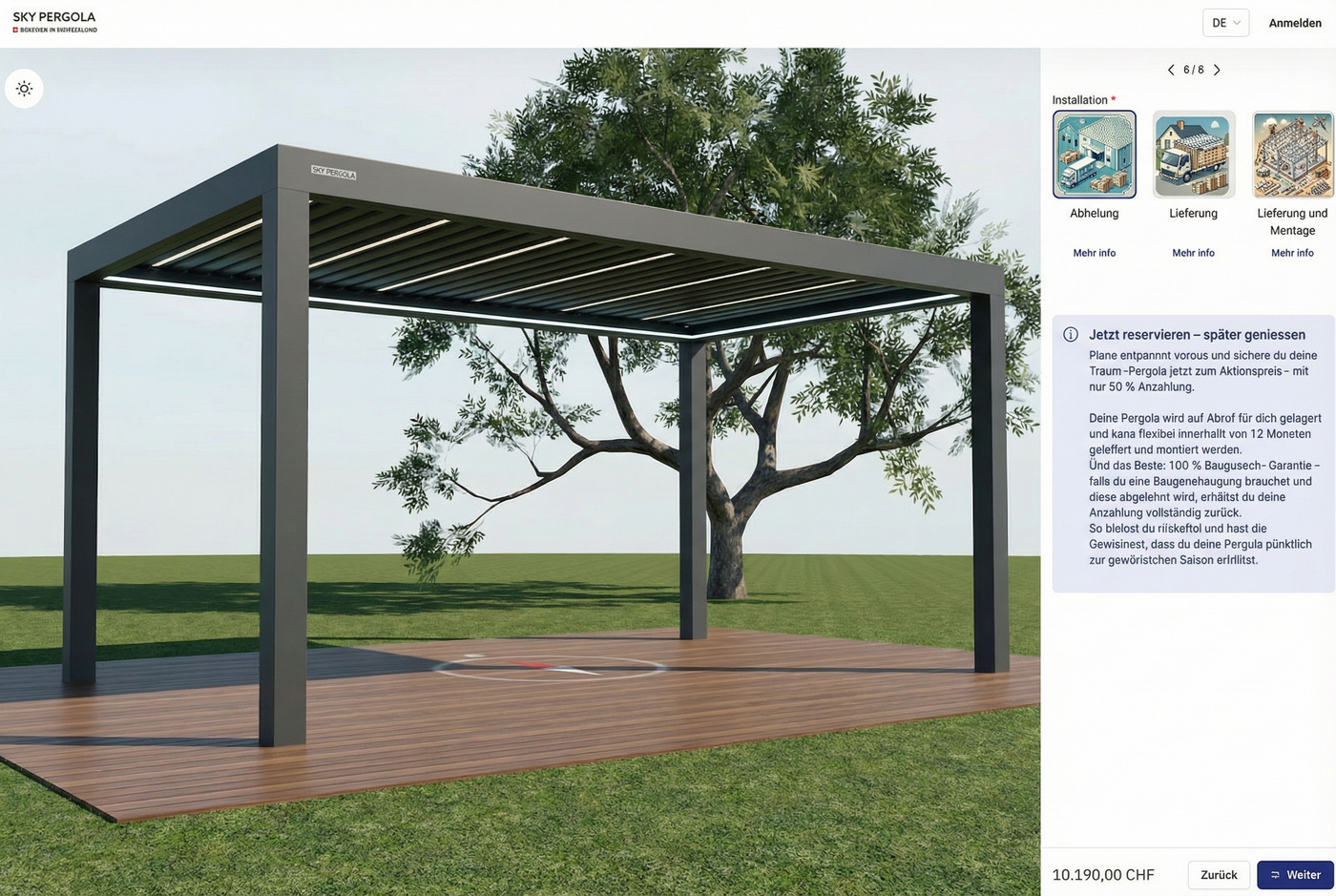 Im Konfigurator siehst du deine Sky Pergola von Anfang an realistisch.