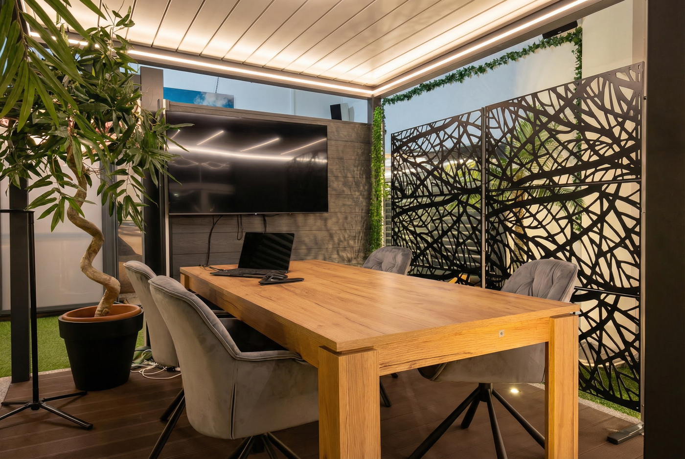 Der SkyPergola Wintergarten verbindet die Leichtigkeit einer Pergola mit dem Komfort eines geschlossenen Wohnraums. Durch die stabilen Glaswände, isolierende Materialien und die moderne LamellentechnolDer SkyPergola Wintergarten vereint modernes Design mit ganzjährigem Wohnkomfort – stilvoll, wetterfest und vielseitig nutzbar.