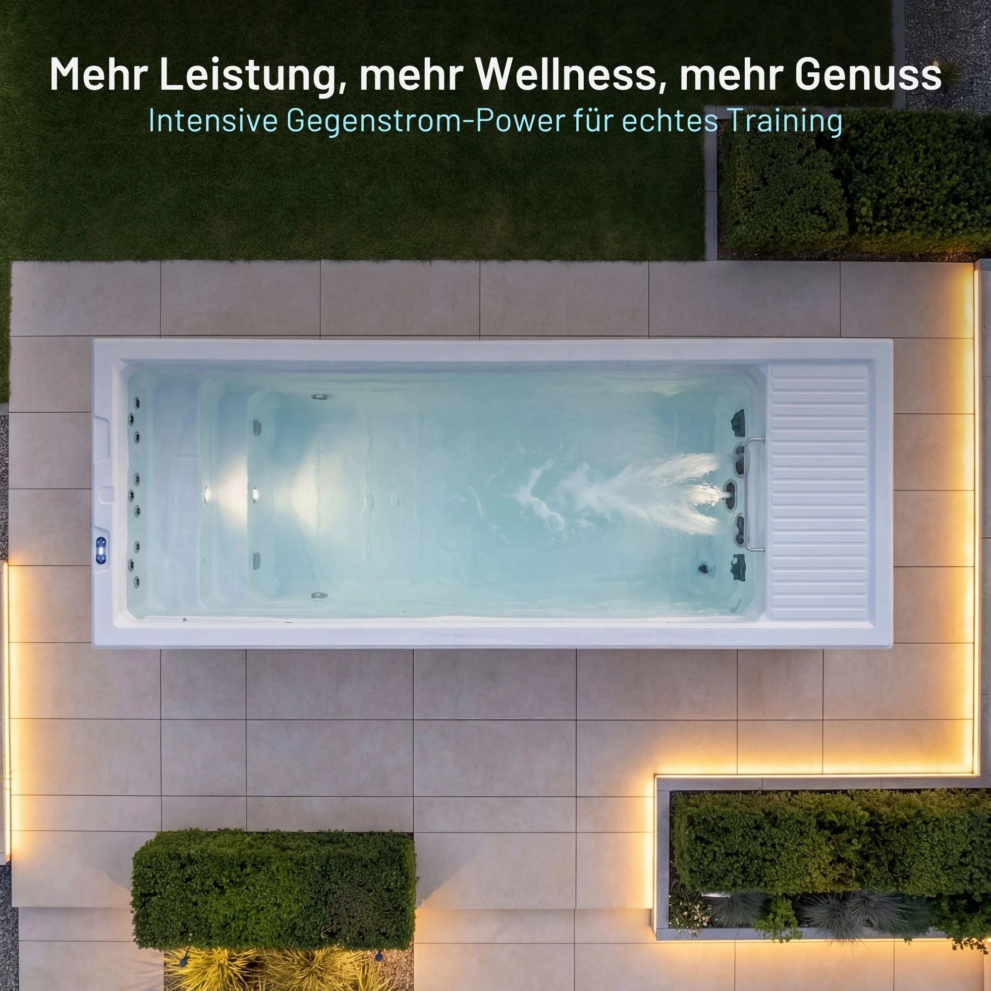 Due pompe di massaggio da 2,2 kW generano una potente corrente contraria per un allenamento di nuoto realistico.