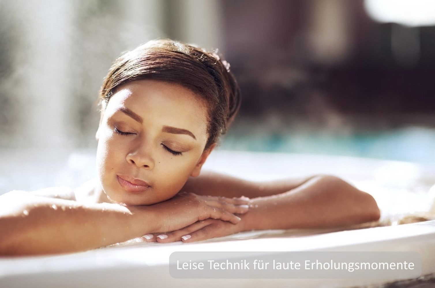 Anche a pieno regime, le nostre vasche a idromassaggio funzionano a un massimo di 64 dB, paragonabile al volume di una normale conversazione. In modalità filtro sono praticamente silenziose. Grazie alle pompe con cuscinetti a sfera e caricate a molla, è possibile godere di prestazioni complete, senza alcun inquinamento acustico.
