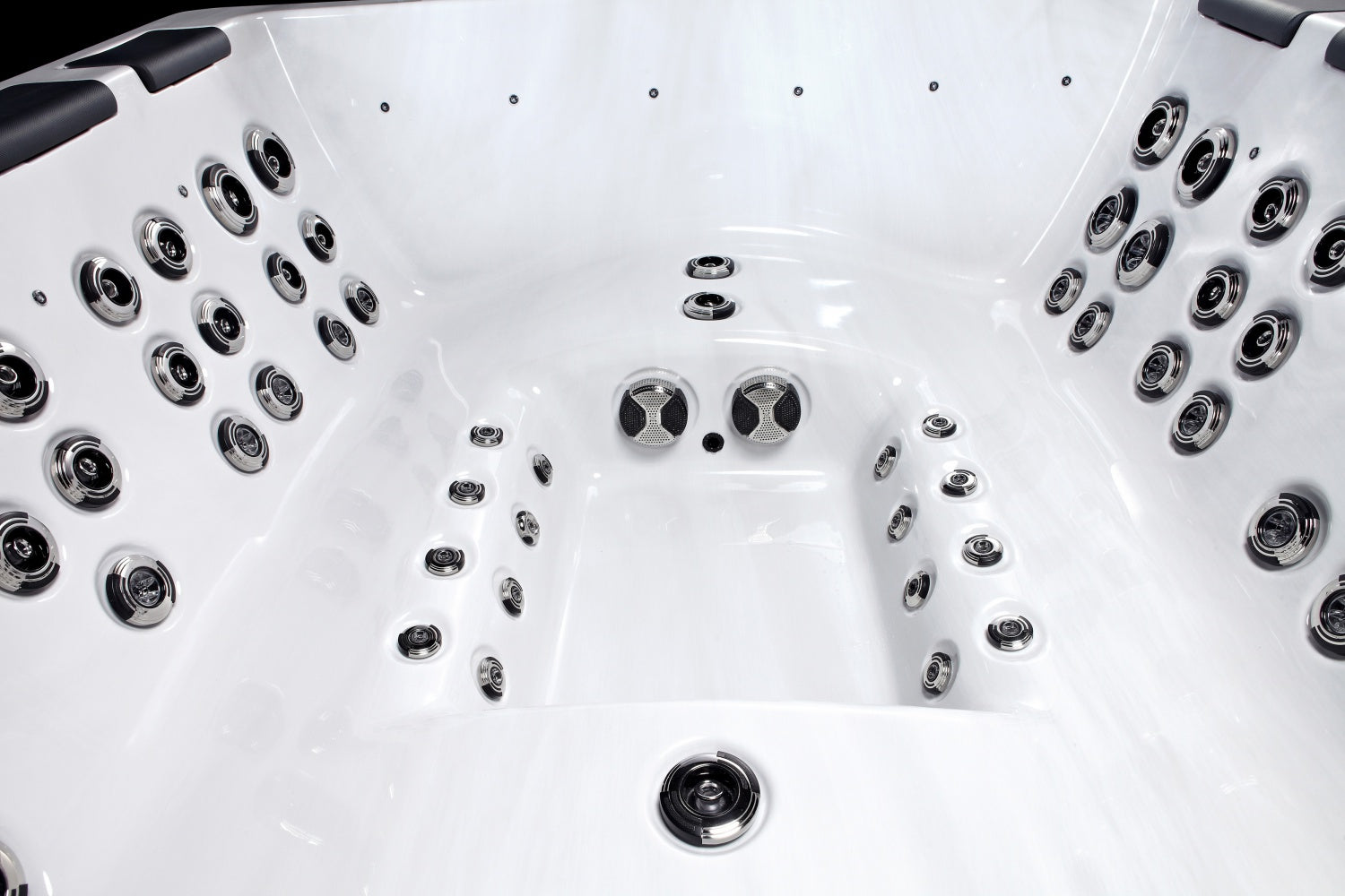 Un totale di 65 getti massaggianti in acciaio cromato offre un'esperienza di benessere personalizzabile, tra cui getti massaggianti spot, rotojet medi e rotojet grandi.