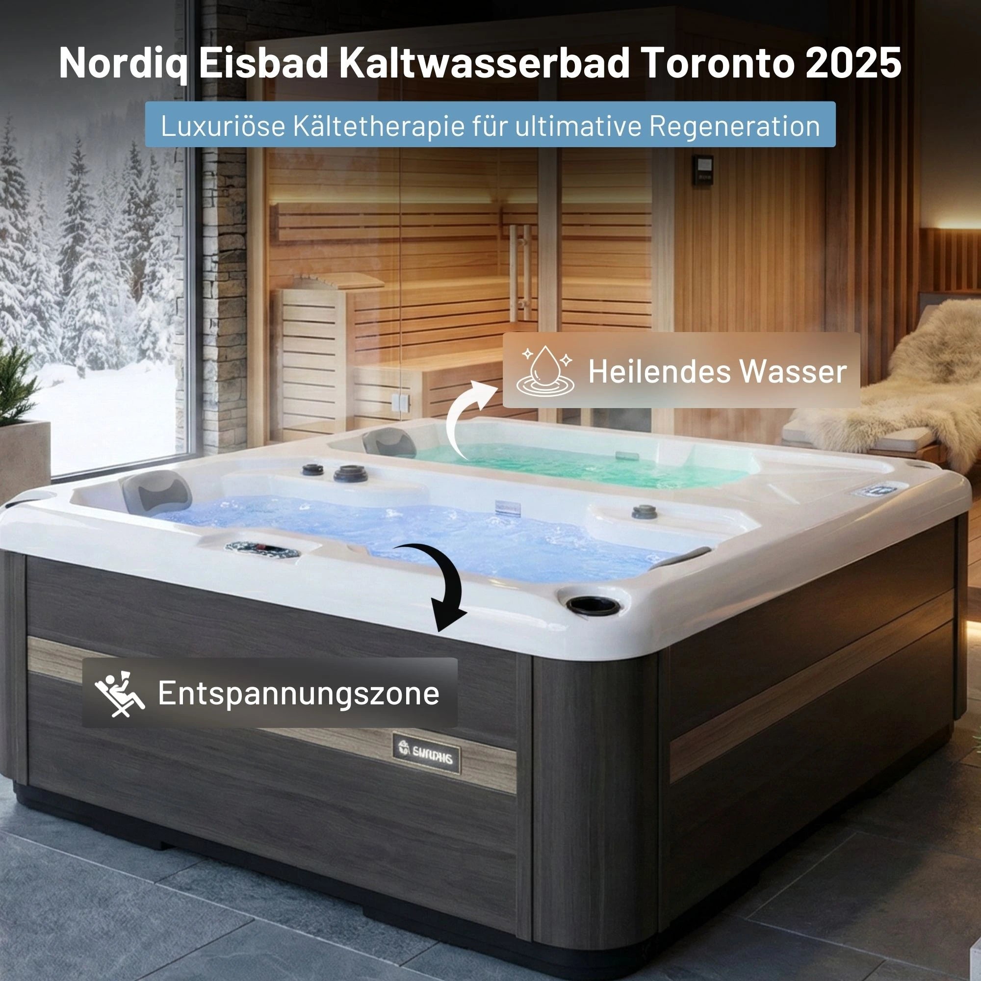 Mit einer großzügigen Sitzkapazität für bis zu drei Personen und den Maßen von 2200mm x 2200mm x 940mm bietet der Cold Plunge Toronto genügend Platz für ein gemeinsames Eisbaderlebnis.