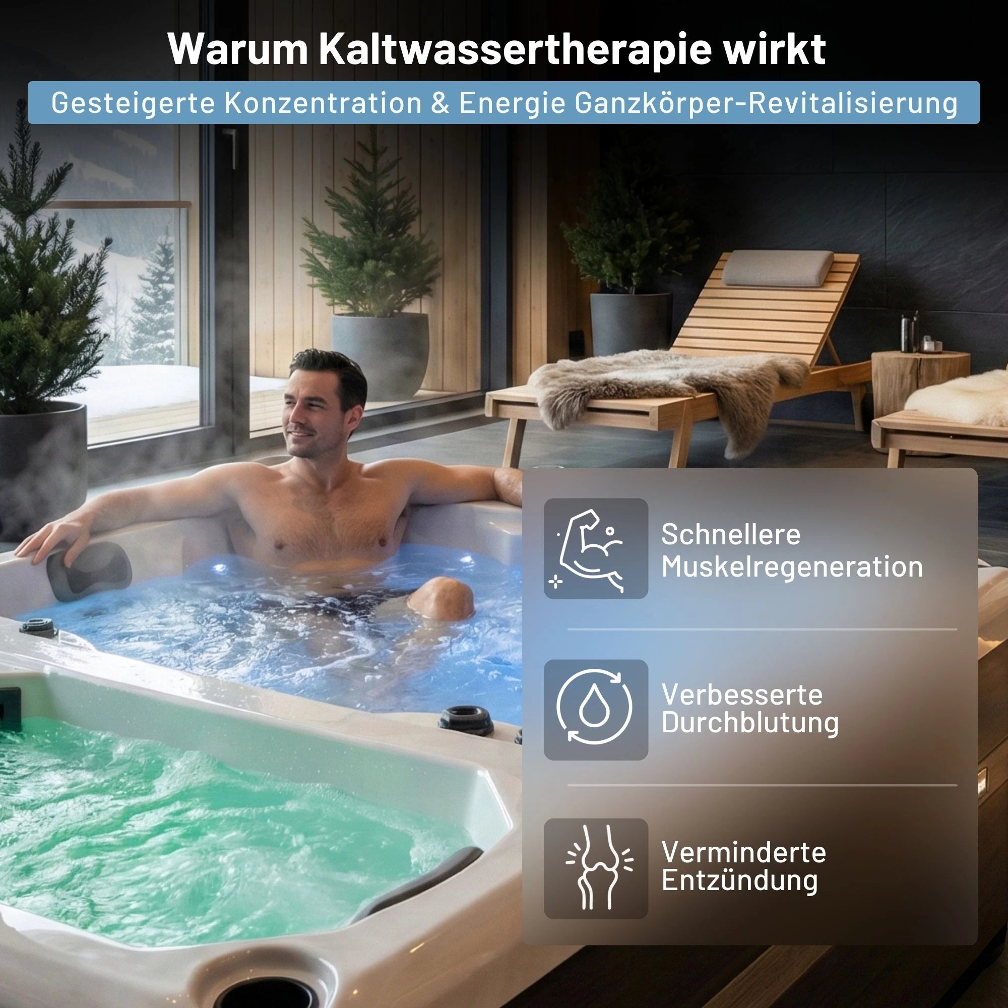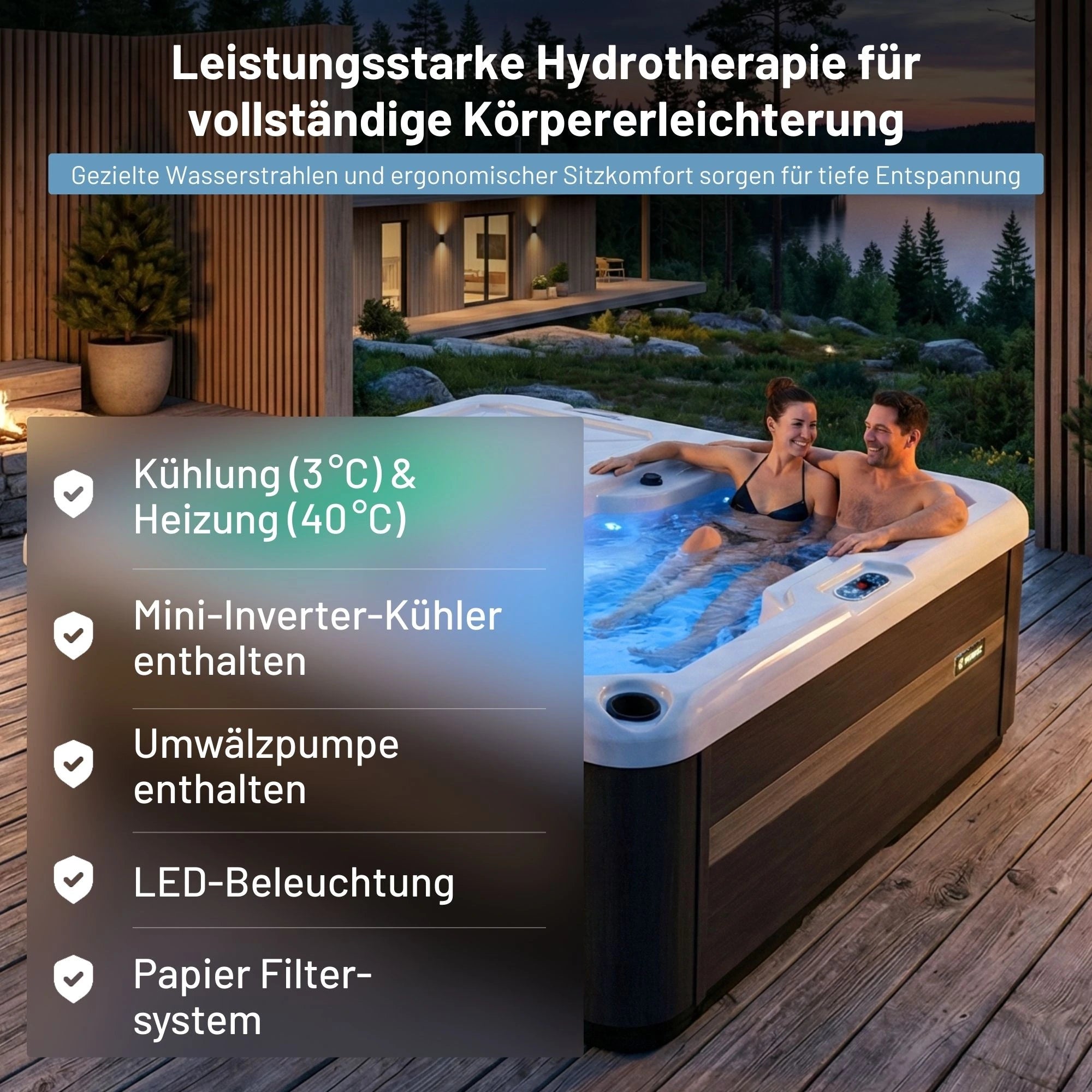 Der eingebaute Mini-Inverter-Chiller kühlt das Wasser auf bis zu 5°C ab – perfekt für eine schnelle Regeneration nach intensiven Trainingseinheiten oder zur Förderung der Gesundheit.