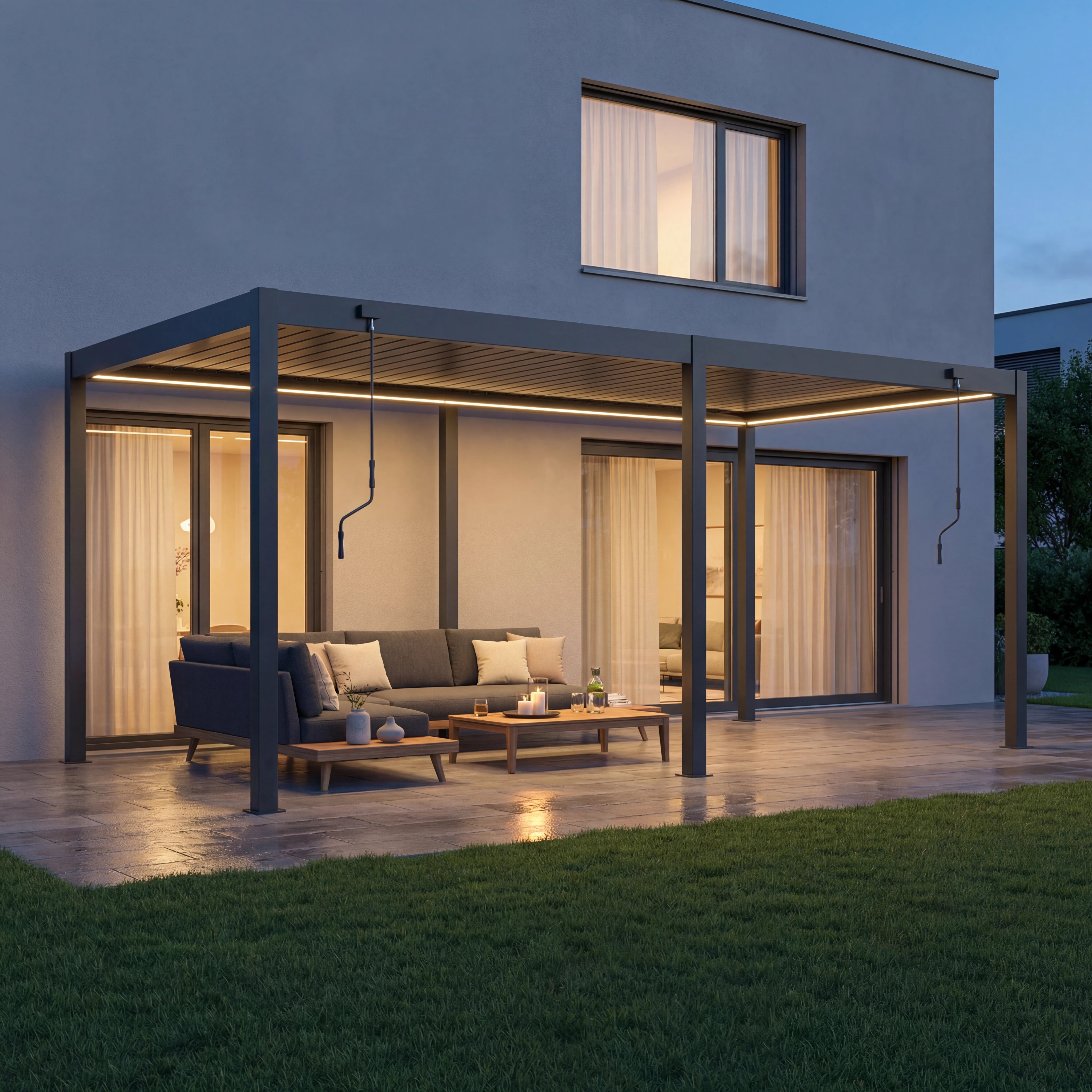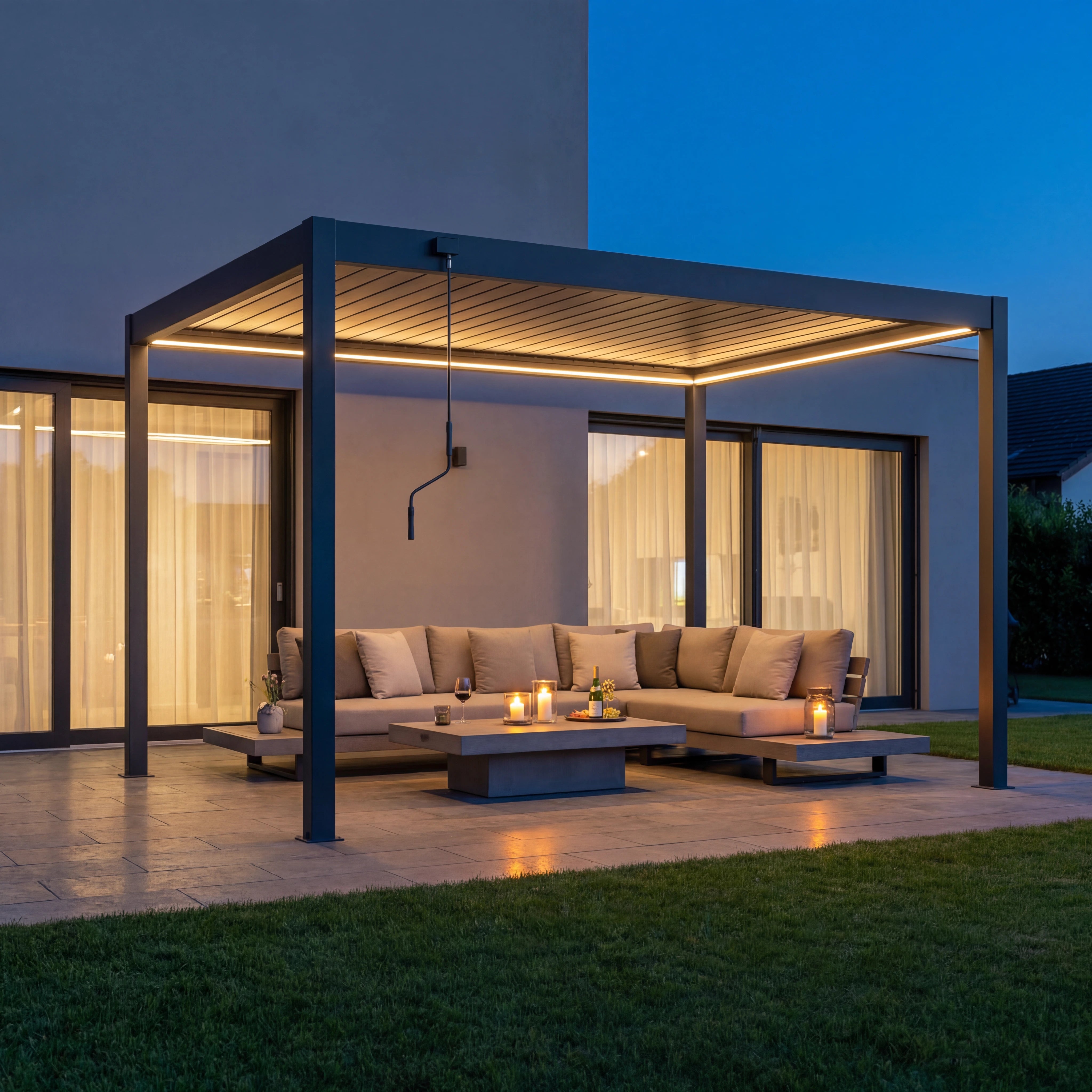 Im Rahmen der Pergola ist eine warmweisse LED-Beleuchtung integriert, die für angenehmes, blendfreies Licht in den Abendstunden sorgt. Die Beleuchtung ist dezent, stilvoll und dimmbar – perfekt für stimmungsvolle Atmosphäre auf der Terrasse oder im Garten.