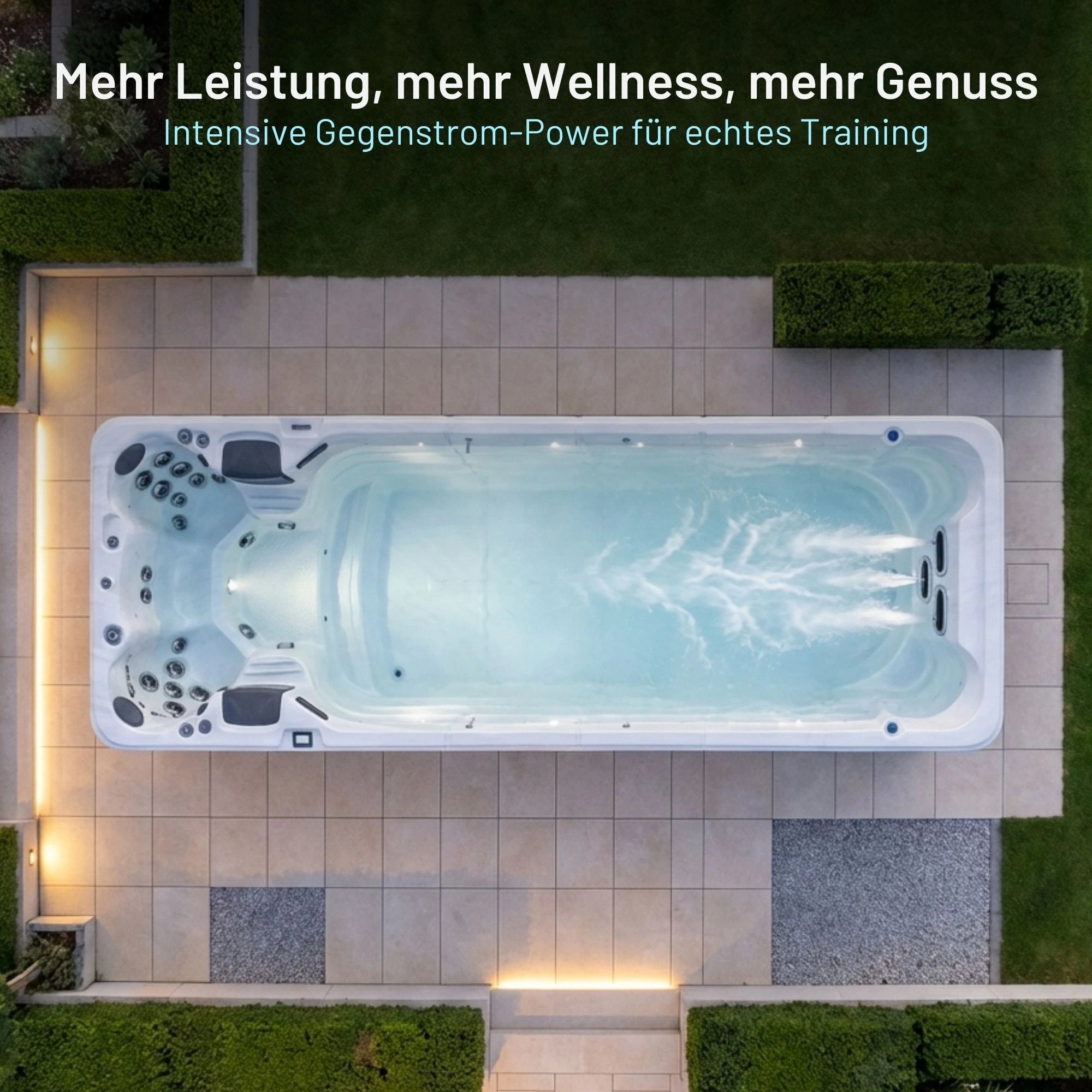 Ja, unsere Swimspas sind rundum mit LED-Beleuchtung ausgestattet: Düsen, Cupholder, Nackenstützen, Drehknöpfe, Halterungen, Wasserfall, Wasserspiele, Wasserlinie, Ecken und sogar Außenstreifen – alles ist stilvoll beleuchtet für ein stimmungsvolles Ambiente.