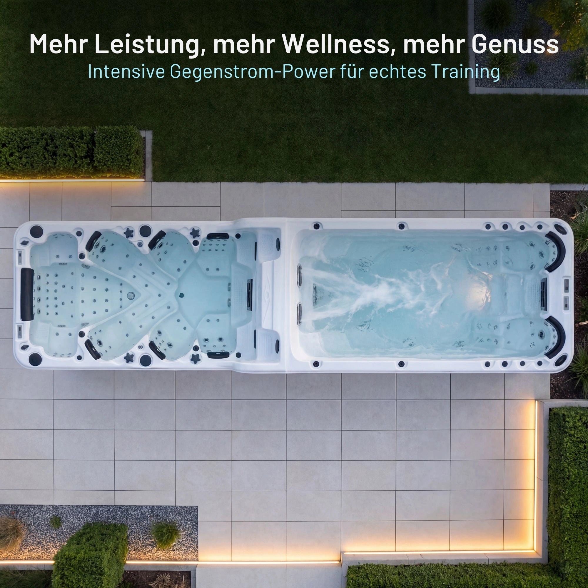 Egal ob sportliches Schwimmtraining, tiefgehende Hydromassagen oder entspannte Stunden mit Musik und Licht – dieser Spa erfüllt jede Anforderung auf höchstem Niveau.