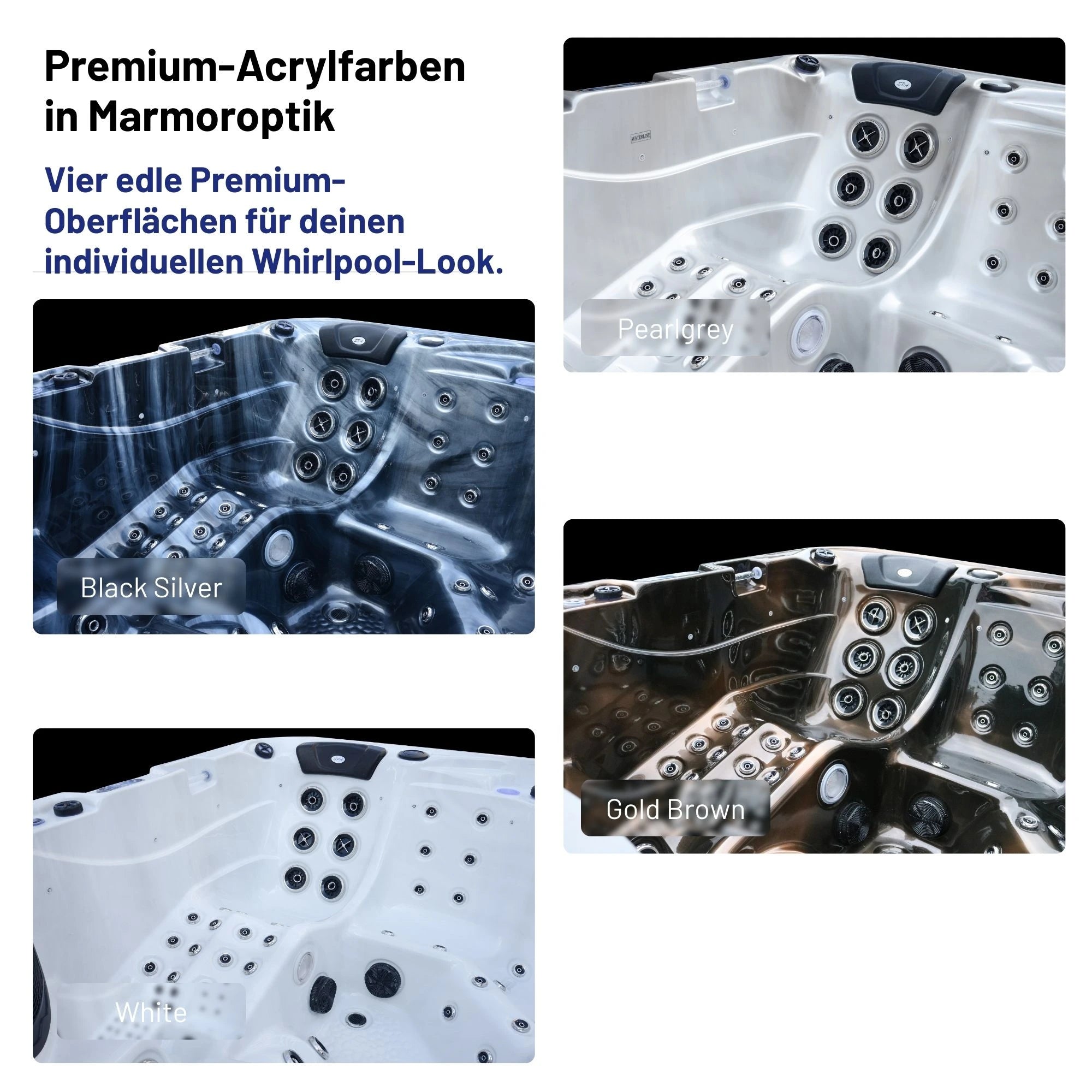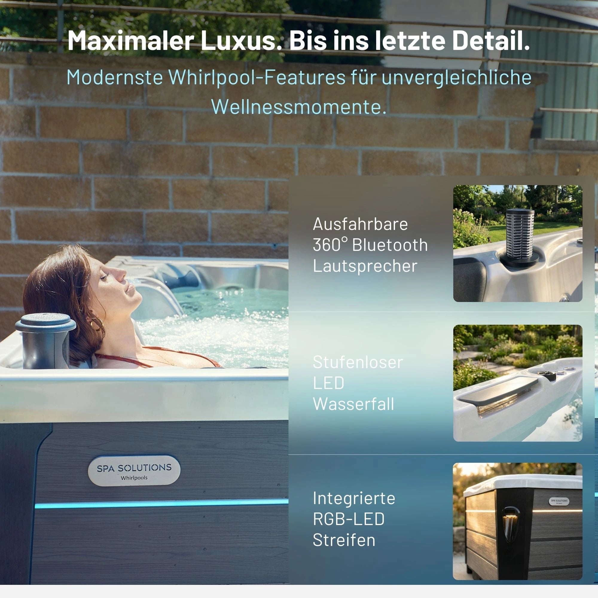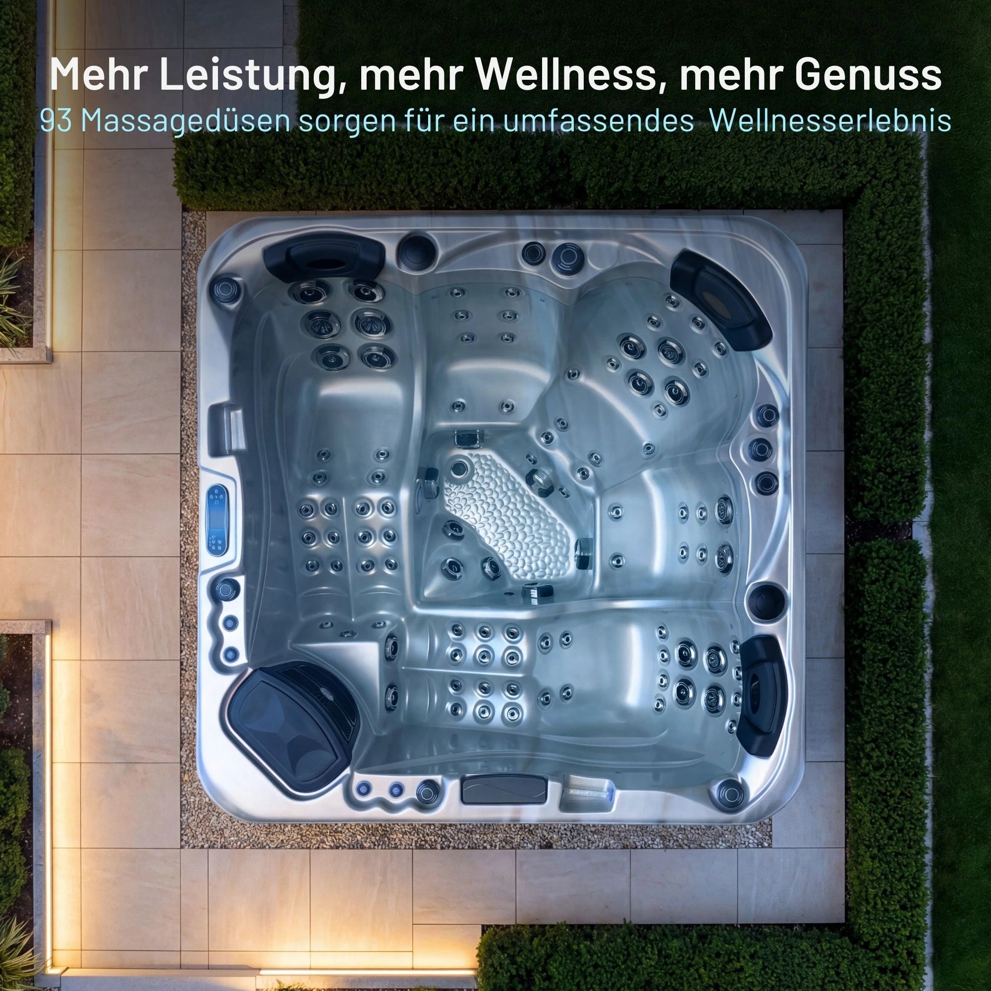 Insgesamt 93 Massagedüsen aus Chromestahl sorgen für ein individuell anpassbares Wellnesserlebnis – darunter Punktmassagedüsen, mittlere Rotojets und große Rotojets. Auch die LED-Beleuchtung ist ein Highlight: von der Wasserlinie über die Cupholder bis zu den Wasserspielen ist alles stilvoll beleuchtet.
