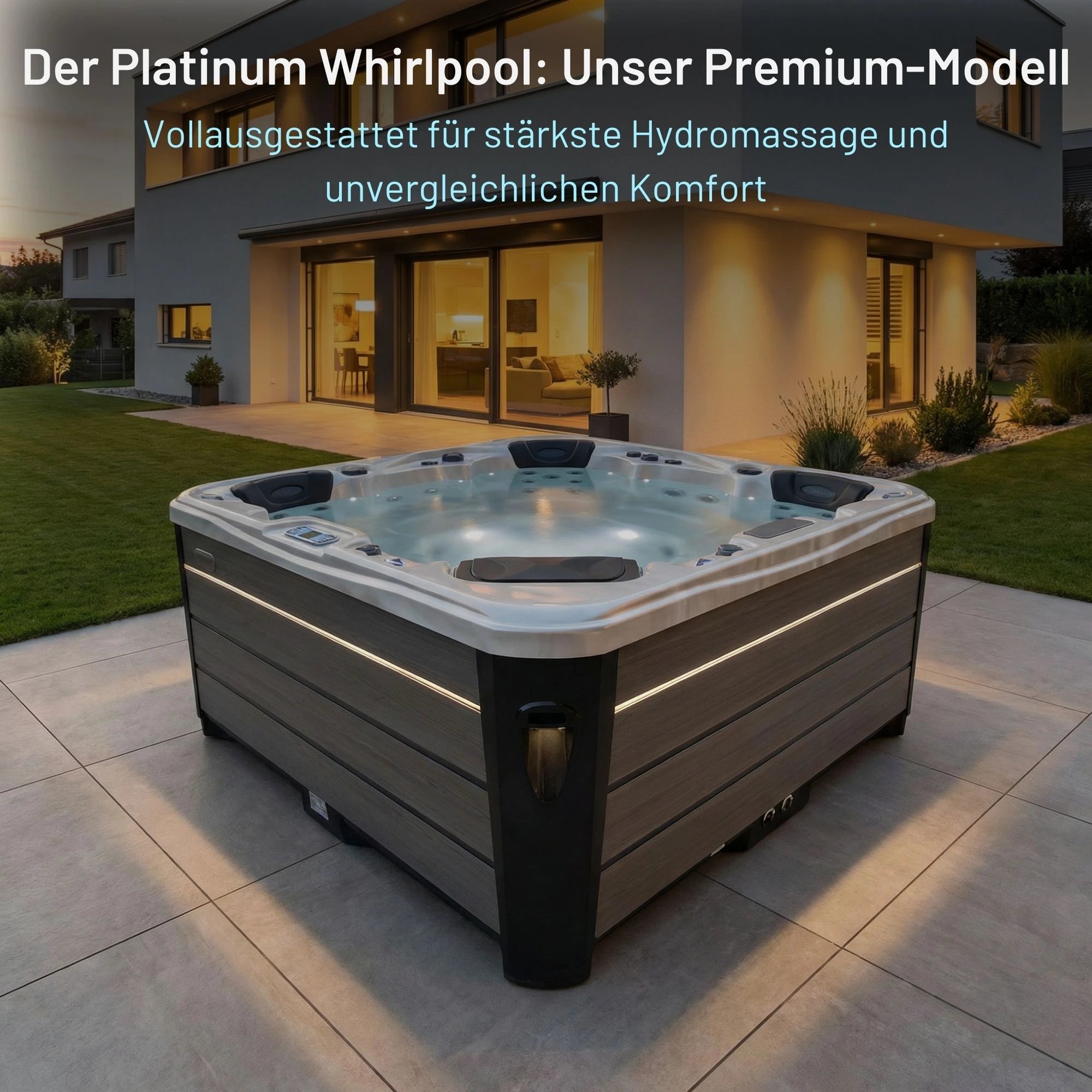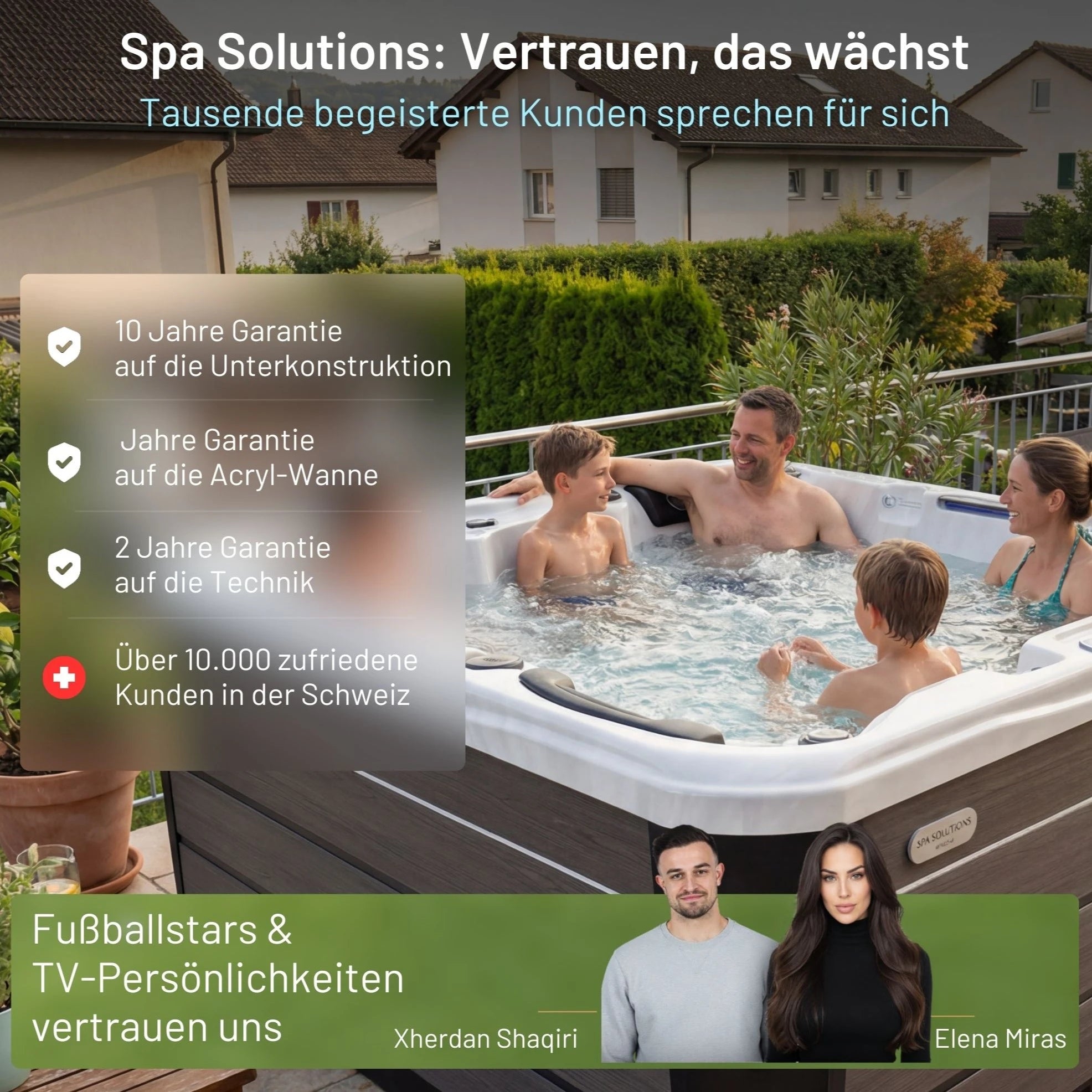 Unsere Whirlpools bieten serienmäßig volle Ausstattung – inklusive Balboa-Steuerung aus den USA, LED-Beleuchtung, Wasserfall, Bluetooth-Soundsystem und bis zu 93 Massagedüsen. Sie sind sofort ab Lager verfügbar, werden durch unser eigenes Montageteam installiert und können in unserem Showroom in der Schweiz besichtigt werden. Mit bis zu 10 Jahren Ersatzteilgarantie und einer Haltbarkeit von über 15 Jahren bieten wir ein ausgezeichnetes Preis-Leistungs-Verhältnis.