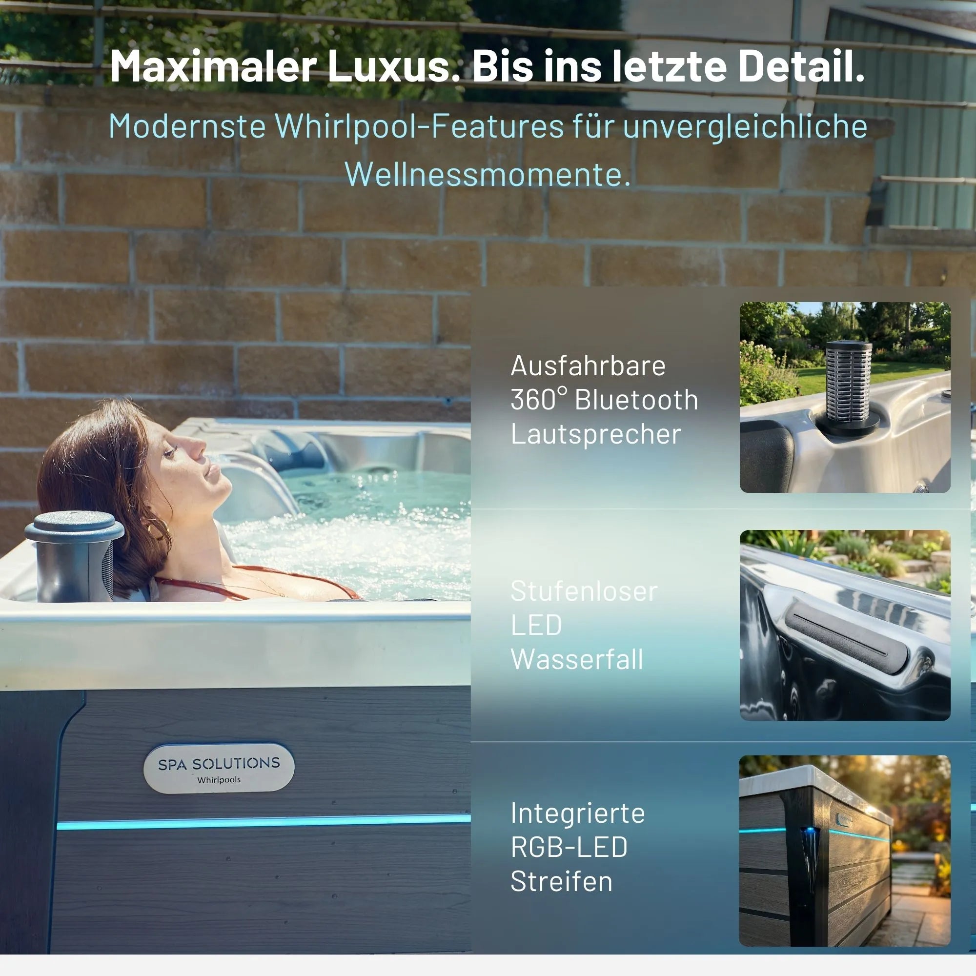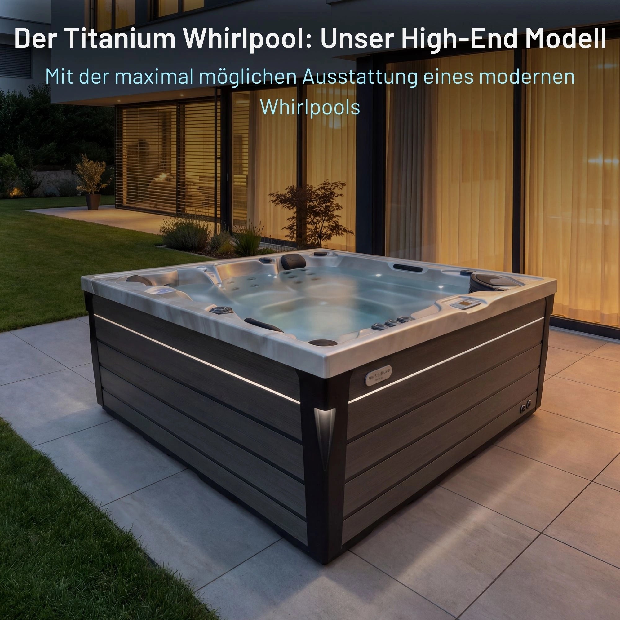 Ja, unsere Whirlpools sind rundum mit LED-Beleuchtung ausgestattet: Düsen, Cupholder, Nackenstützen, Drehknöpfe, Halterungen, Wasserfall, Wasserspiele, Wasserlinie, Ecken und sogar Außenstreifen – alles ist stilvoll beleuchtet für ein stimmungsvolles Ambiente.