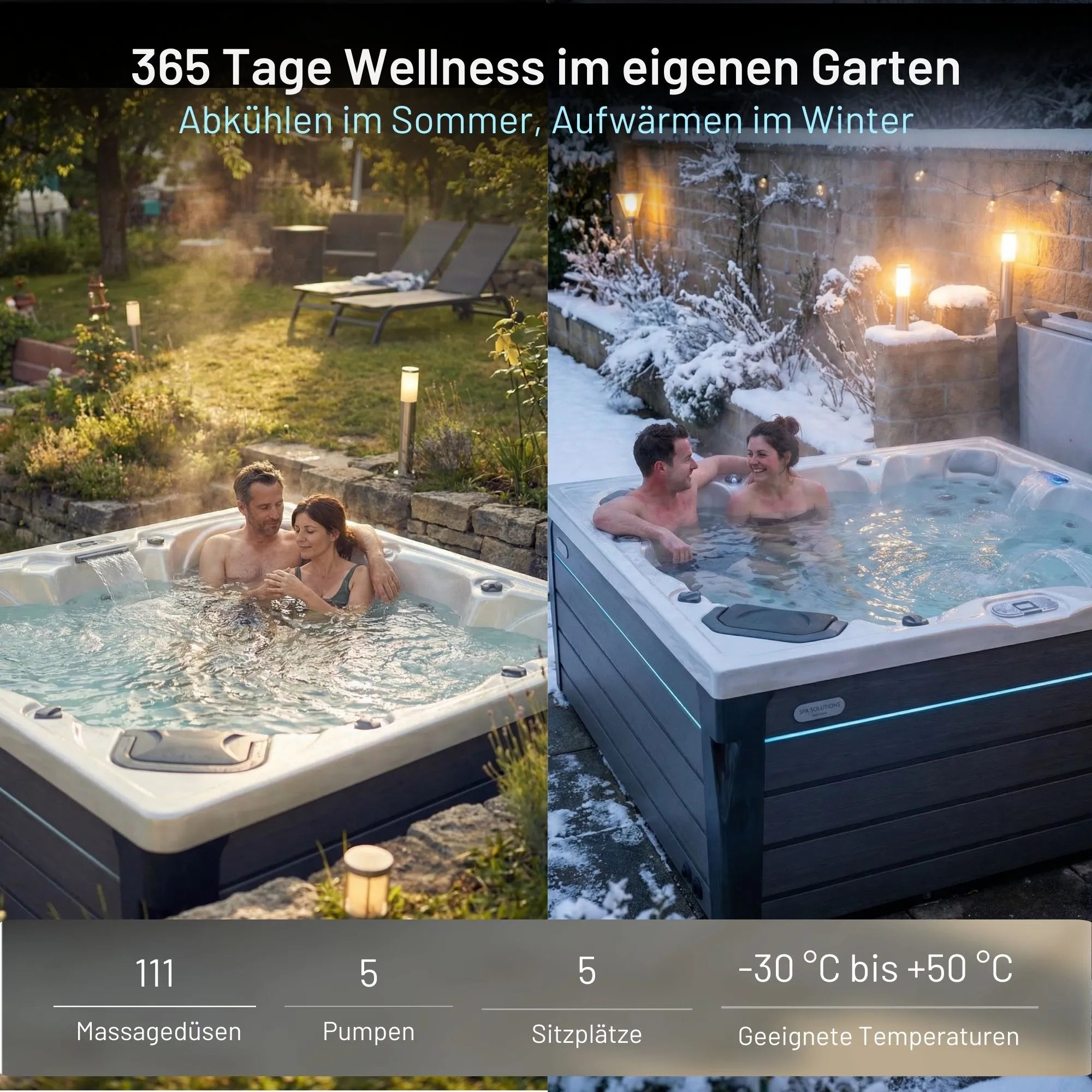 Ja, unsere Whirlpools sind vollständig wintertauglich – auch bei Temperaturen bis -30 °C. Sie können ganzjährig betrieben und bei Bedarf auf bis zu 40 °C aufgeheizt werden.