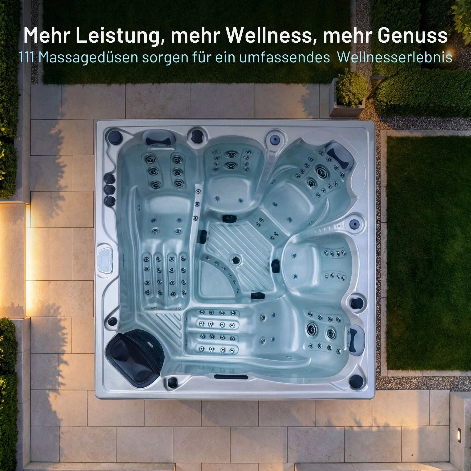 Insgesamt 111 Massagedüsen aus Chromestahl sorgen für ein individuell anpassbares Wellnesserlebnis – darunter Punktmassagedüsen, mittlere Rotojets und große Rotojets. Auch die LED-Beleuchtung ist ein Highlight: von der Wasserlinie über die LED-Streifen bis zu dem Wasserfall ist alles stilvoll beleuchtet.